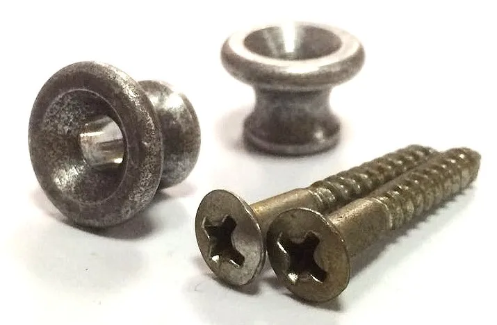 Transform your Gibson-style guitar with this pair of Gotoh EP-A1 Solid Aluminum Relic-Style Guitar Strap Buttons. Crafted from durable metal, these strap pins feature an intentionally aged, vintage appearance with distressed metallic patina. The weathered, tarnished finish and textured surface evoke a timeless, worn look, perfect for adding a nostalgic touch to your instrument. Designed to replicate classic relic hardware, they enhance the aesthetic of well-used, antique guitars while providing reliable attachment points. The circular bases are slightly domed, with a cylindrical sleeve and a secure slot for your strap. These buttons bring craftsmanship and retro charm to your guitar, making it stand out with authentic vintage character.