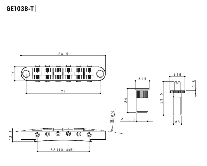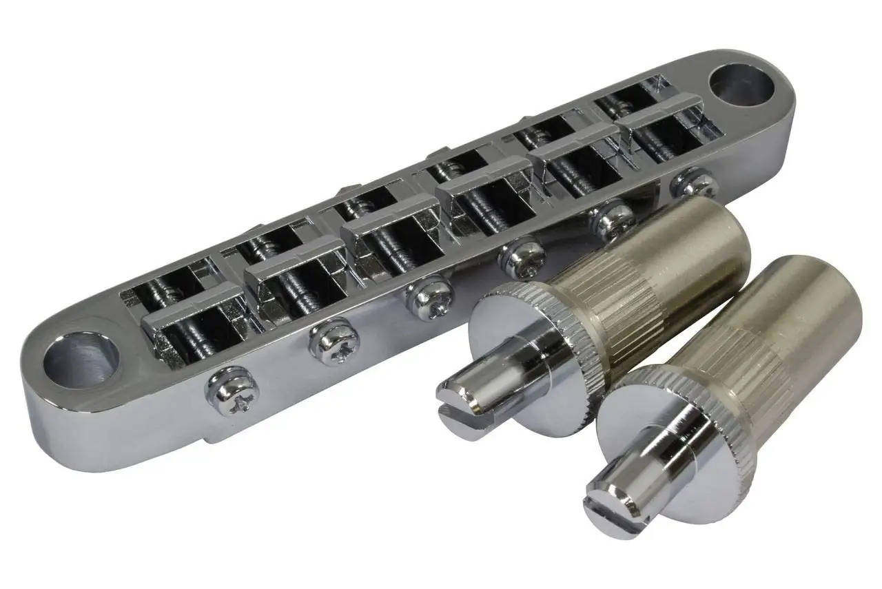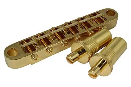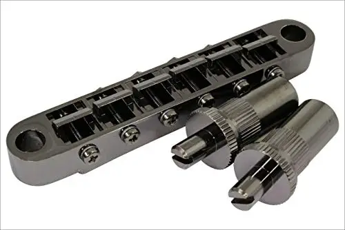 Experience enhanced sound and playability with this high-quality Gotoh GE103B-T Tune-O-Matic style guitar bridge. Its sleek metallic finish, available in Nickel, Chrome, Gold, or Cosmo Black, adds a modern touch to your instrument. Designed for durability and precision, this bridge features large M8 threaded posts with flat screwdriver adjustment, ensuring easy setup and secure mounting. The elongated rectangular body with rounded edges provides a clean, minimalistic aesthetic, while the adjustable saddles with small screws allow for precise intonation. With a saddle radius of 12″, string spacing of 2 1/16″ (52 mm), and stud spacing of 2 29/32″ (74 mm), it fits many import guitars requiring larger stud posts. This product offers a perfect combination of style, stability, and technical excellence for your guitar upgrade.