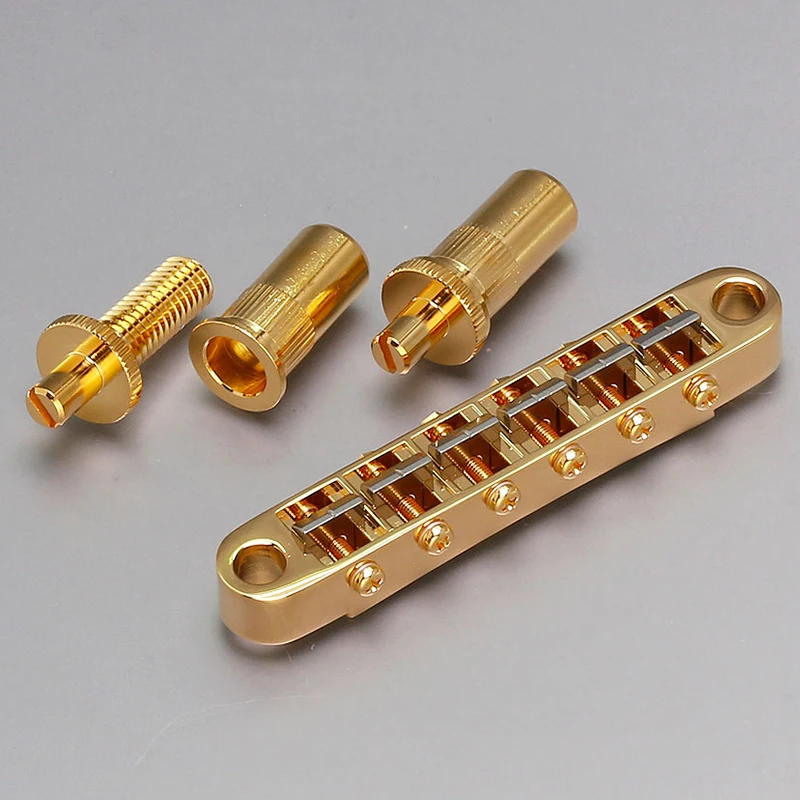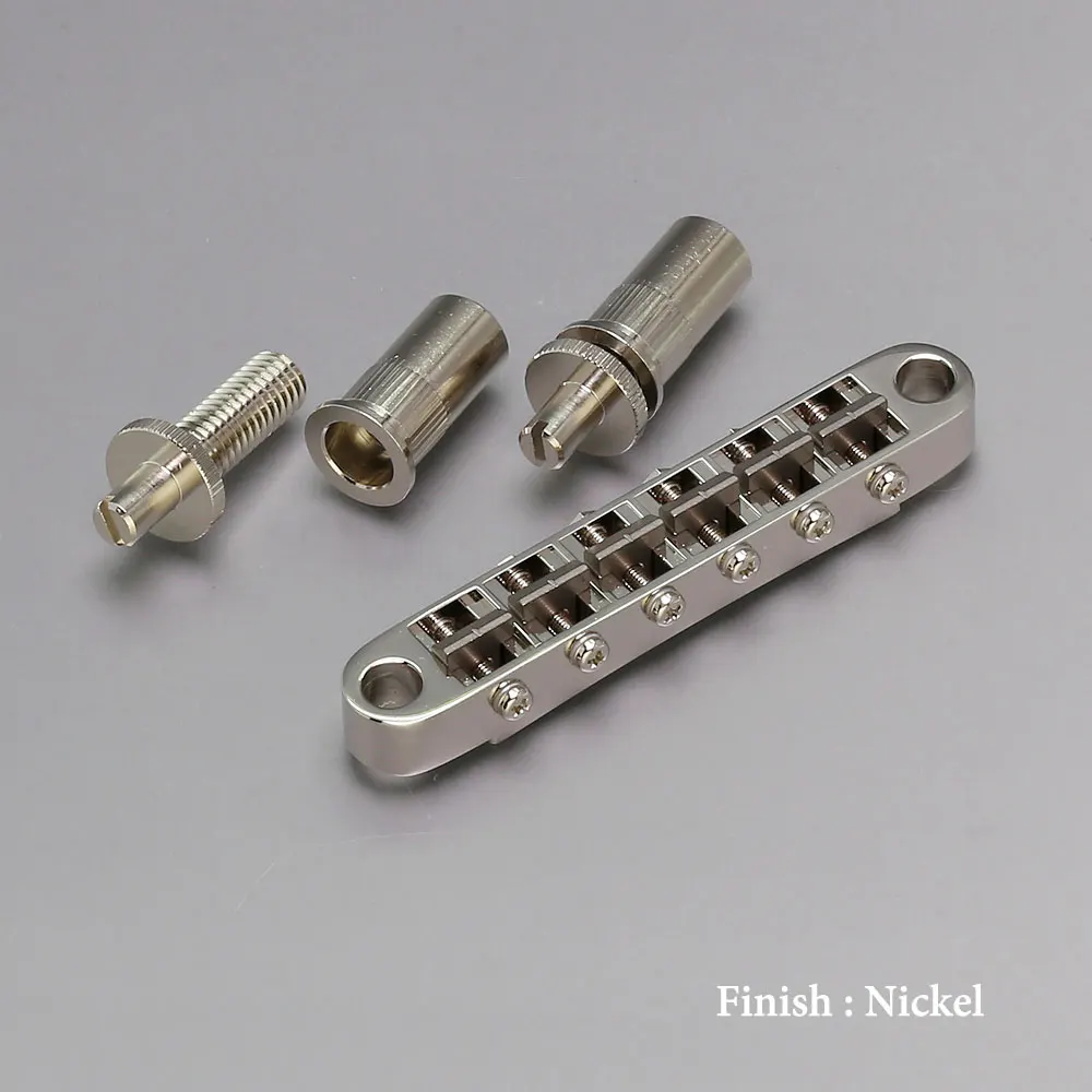 Experience superior tone and durability with the Gotoh Ti103B-T Titanium Tune-O-Matic guitar bridge, crafted from high-quality titanium and finished in chrome. Featuring a center-to-center post spacing of 2-29/32″ (74mm) and a string spacing of 2-1/16″ (52.4mm) with pre-notched saddles, it offers enhanced saddle adjustment for thicker strings. Compatible with 4mm threaded bridge posts for direct installation into the guitar body, this Japanese-made bridge combines Nashville and ABR-1 style designs for optimal performance. Made of sturdy metal and including secure mounting studs, it’s the perfect upgrade for players seeking a blend of precision, style, and reliability.