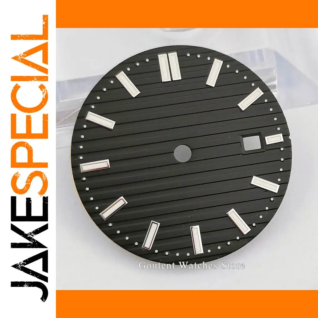 This Goutent watch dial is a stunning blend of modern aesthetics and functionality. Made from durable stainless steel, the round dial features a striking black background with a grooved texture that enhances its visual appeal. The unique elongated rectangular hour markers and subtle white dot minute markers provide an elegant contrast against the dark surface, making it easy to tell time at a glance. A small square date aperture between 4 and 5 o'clock adds practicality without overwhelming its sleek design. This stylish watch dial fits various automatic movements, ensuring versatility for your collection while reflecting your personal taste.