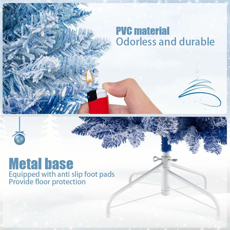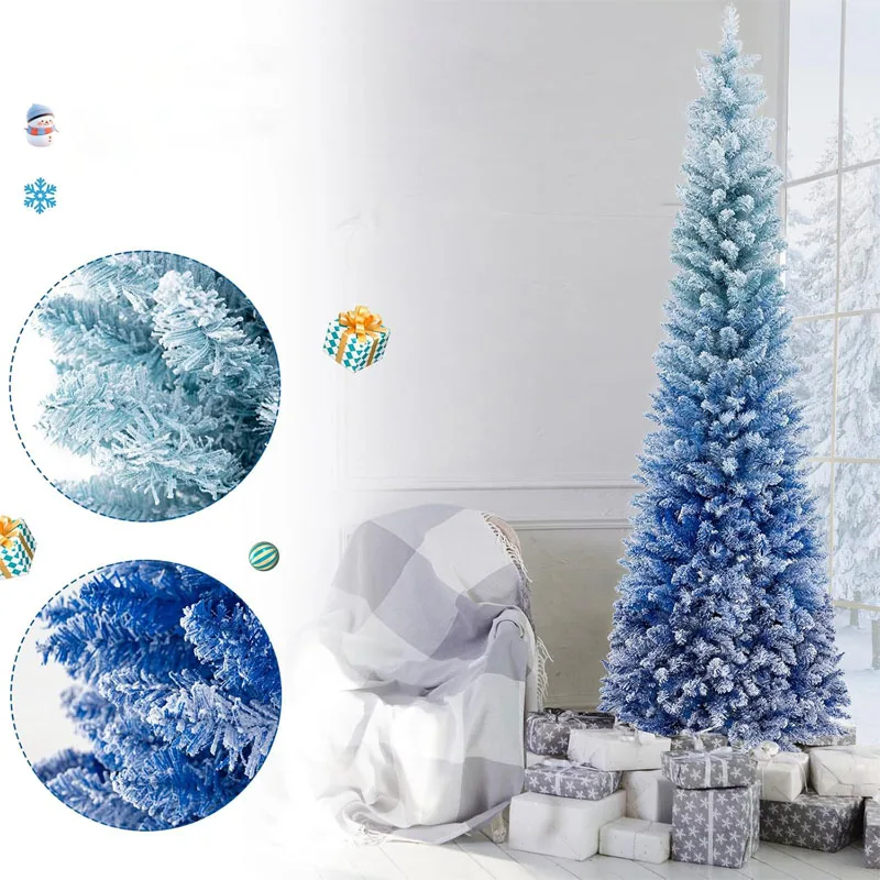 Immerse yourself in the festive spirit with this beautifully crafted artificial Christmas tree featuring a captivating gradient blue color. Designed with a pointed, conical shape, it boasts densely packed PVC branches that mimic the fullness and realism of a natural evergreen. The snow-like flocked finish adds a charming wintery touch, perfect for creating a warm holiday atmosphere in your home or commercial space. Standing tall with an elegant silhouette, this tree ranges from 150cm to 180cm, making it an ideal centerpiece for holiday decorations. Its sturdy white stand ensures stability, allowing you to decorate it with lights, ornaments, and garlands for a magical Christmas display. Bring joy and elegance to your celebrations with this eye-catching tree.