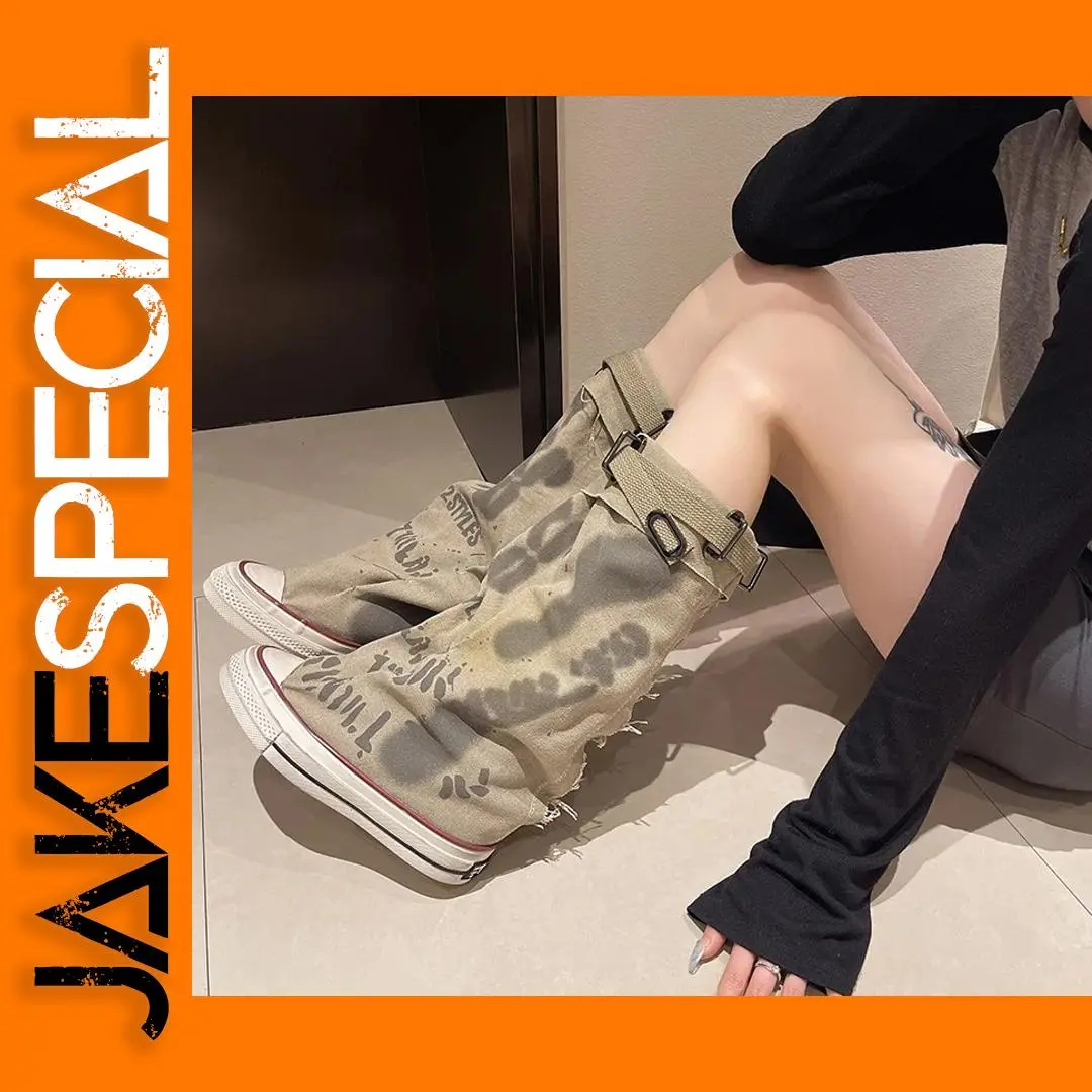 Step into the world of street fashion with this pair of this graffiti high top canvas shoes designed for women. Perfect for adding a rebellious touch to your casual look, these boots combine comfort and style effortlessly. Crafted with attention to detail, they feature a knee-high silhouette that offers a bold appearance while remaining easy to slip on for everyday wear. The graffiti pattern adds a unique flair, making these boots stand out in any crowd. Whether you're out with friends or exploring the city, these shoes will keep you comfortable and trendy. Their elastic stacking design ensures a snug fit, and the rubber sole provides excellent grip. Redefine your wardrobe with this fashionable, versatile footwear, and enjoy a look that speaks volumes about your personality.