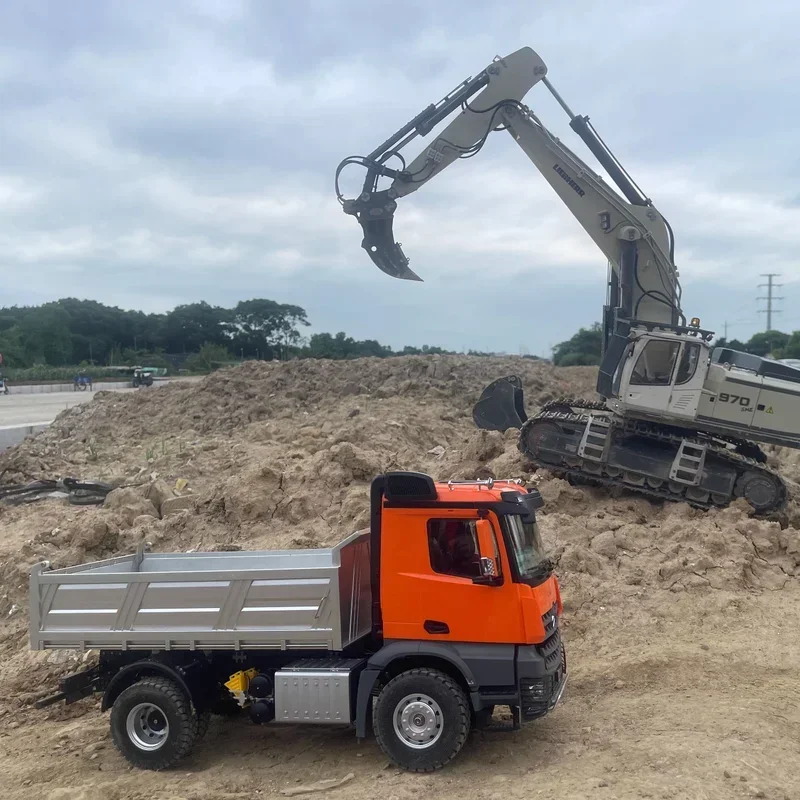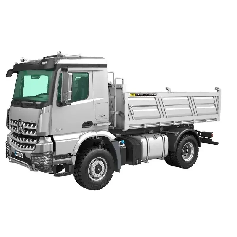 Experience realistic off-road adventures with this 1/14 scale RC dump truck, measuring 542x208x273mm and weighing 4.8kg. Featuring a durable, heavy-duty design with a matte black or gray chassis and a metallic silver dump bed, it boasts large 85mm rugged tires, detailed wheel hubs, and sturdy construction. Powered by a brush motor and lithium battery (not included), it delivers 40-60 minutes of playtime after a 3-5 hour charge. Control is precise via a 2.4GHz remote with over 25 meters range, offering a two-speed gearbox, 47° dump bed lift, realistic light and sound effects, and excellent maneuverability with a 23° approach and 31° departure angles, ideal for collectors and enthusiasts 14 and up.