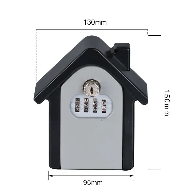 Secure your spare keys easily with this charming, house-inspired key safe. Crafted from durable zinc alloy, it features a sleek gray finish, blending robustness with a subtle, minimalistic style. Its unique house silhouette with a pitched roof adds a friendly touch to your outdoor space. The safe is equipped with a 4-digit rotary combination lock with an initial default code of 0000, ensuring double security. Measuring approximately 150mm x 95mm x 50mm externally and 98mm x 78mm x 45mm internally, it can comfortably store up to five keys no longer than 95mm. Its rust-resistant construction makes it ideal for outdoor environments, safeguarding your keys against tampering and weather elements. Easy to install, it comes with fixing screws and a user manual for hassle-free setup.