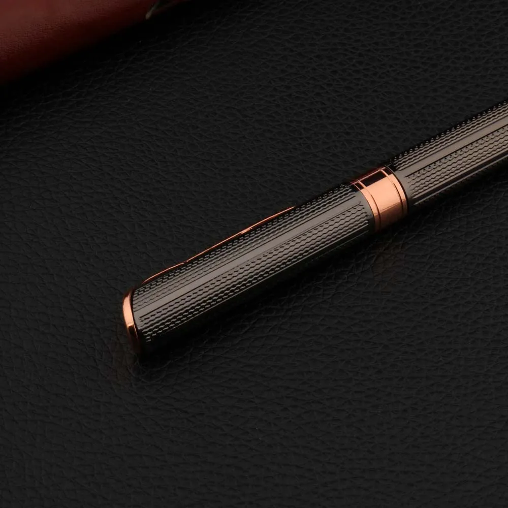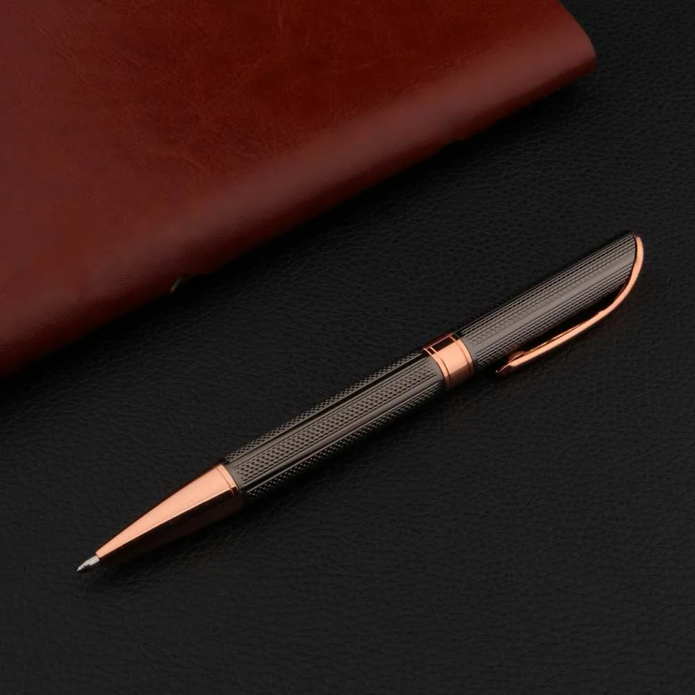 Imagine elevating your writing experience with this sophisticated gray metal ballpoint pen. Designed for both style and function, it features a sleek body adorned with an elegant drawing pattern that runs along its length, making every note or signature feel special. The finely textured grip ensures a comfortable hold during extended use, while the rose gold accents on the tip, clip, and band add a touch of luxury and contrast to the matte gray finish. Crafted for durability yet lightweight enough for daily use, this pen seamlessly blends modern aesthetics with practical craftsmanship. Whether you're in an office or at school, this pen will become your go-to stationery accessory, combining elegance and reliability in every stroke. Own this beautiful writing instrument and make your work stand out.