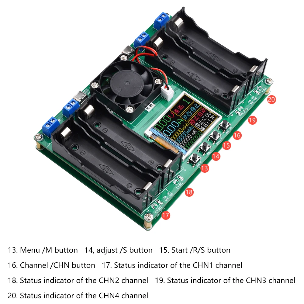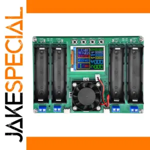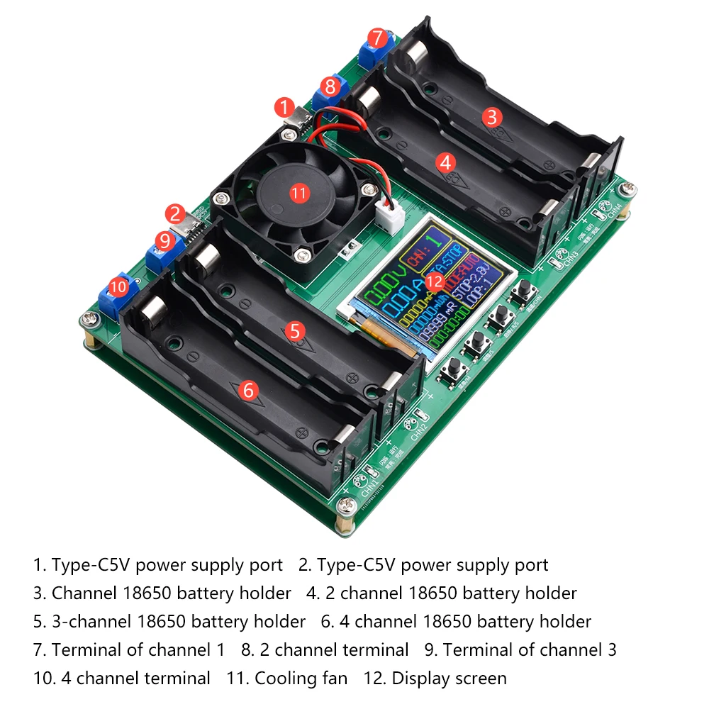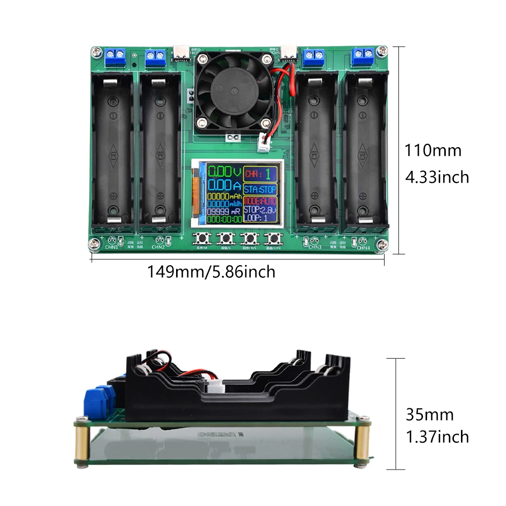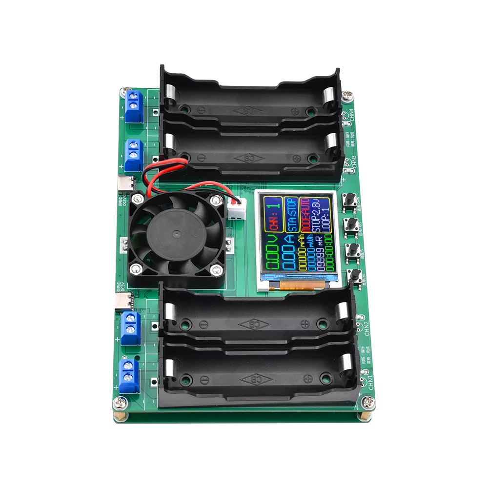 Experience precise and reliable testing with this vibrant green 4-channel lithium battery capacity tester. Designed with a colorful, industrial-inspired aesthetic, it features four black plastic battery slots aligned horizontally for easy insertion of 18650 cells. At the heart of the device is a vivid rectangular LCD screen, displaying real-time data in multiple colors—blue, red, green, yellow, and black—making it easy to monitor voltage, capacity, current, and status at a glance. The active cooling fan and overheat protection ensure stable operation during intense testing cycles. Compact and lightweight, it fits comfortably on your workspace. Whether you're testing batteries for custom projects or professional purposes, this tester combines style with advanced functionality for dependable performance.