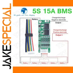 Experience reliable and efficient battery protection with this sleek, green 5S lithium battery management system (BMS). Designed for 18650 cells, it ensures safety, voltage regulation, and balanced charging in various electronic applications. Its high current capacity of 15A makes it ideal for DIY projects, switches, and sensors. The PCB’s industrial-inspired design features organized patterns of surface-mount resistors, capacitors, and integrated circuits, creating a technical yet clean aesthetic. Brightly colored red, black, yellow, and blue wires visually emphasize its versatility and functionality. Durable components like relays and MOSFETs are arranged systematically, highlighting its engineered precision. This BMS provides seamless circuit management and protection, giving you peace of mind in your power solutions.