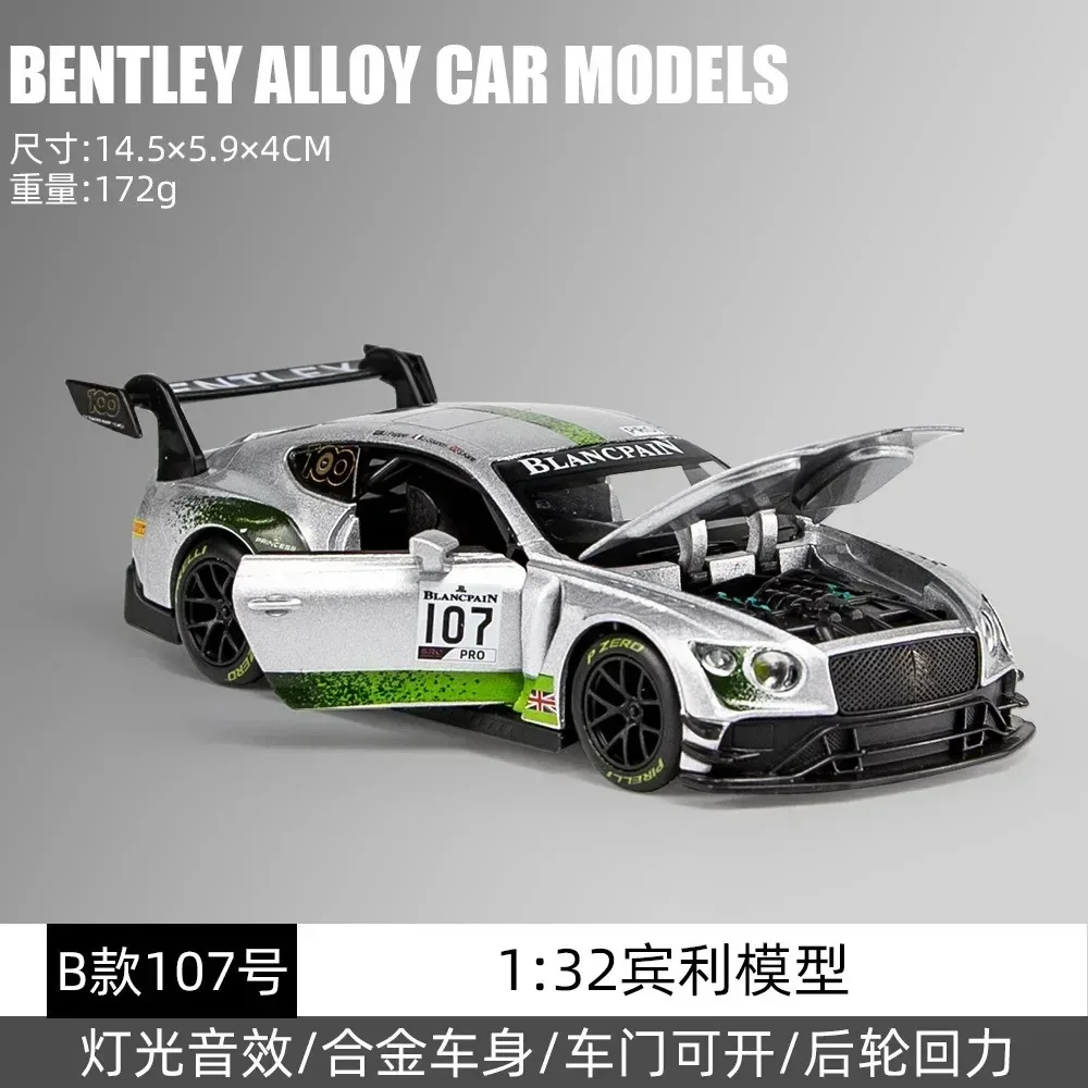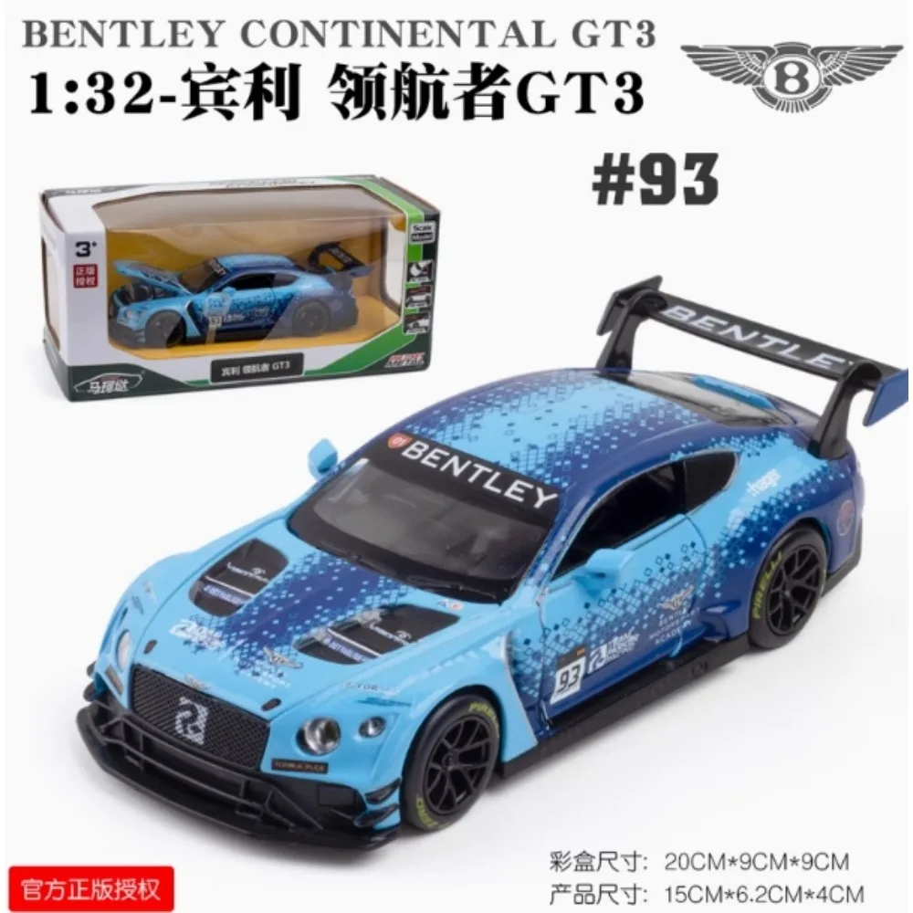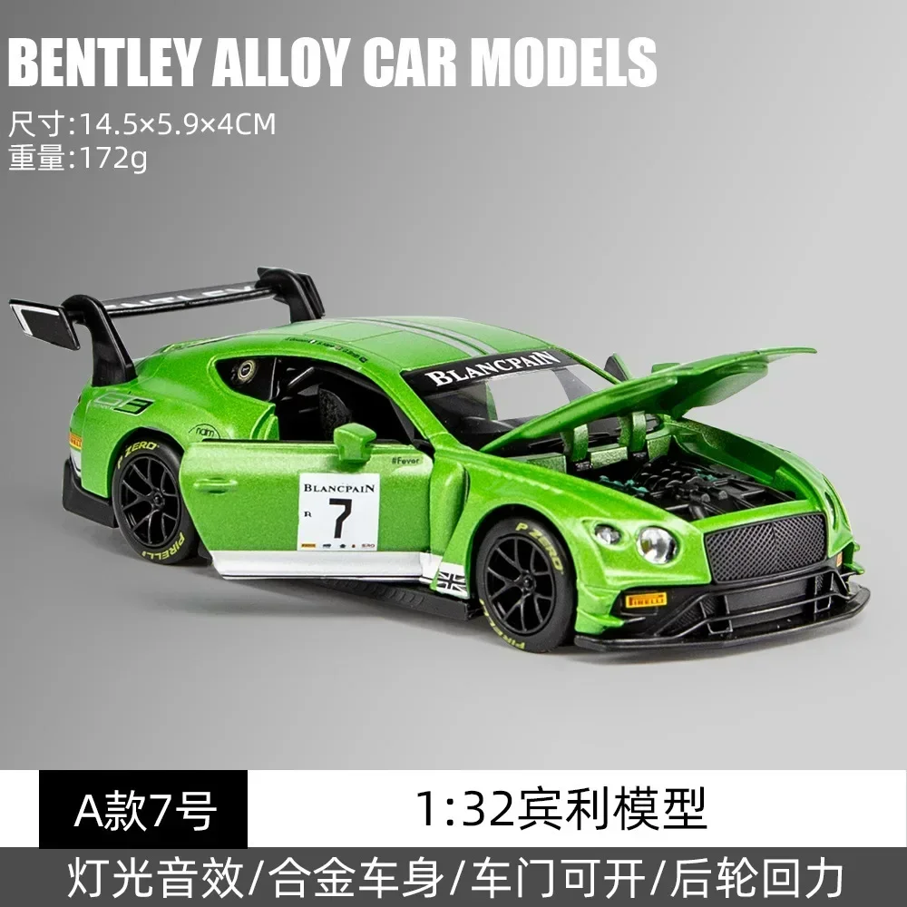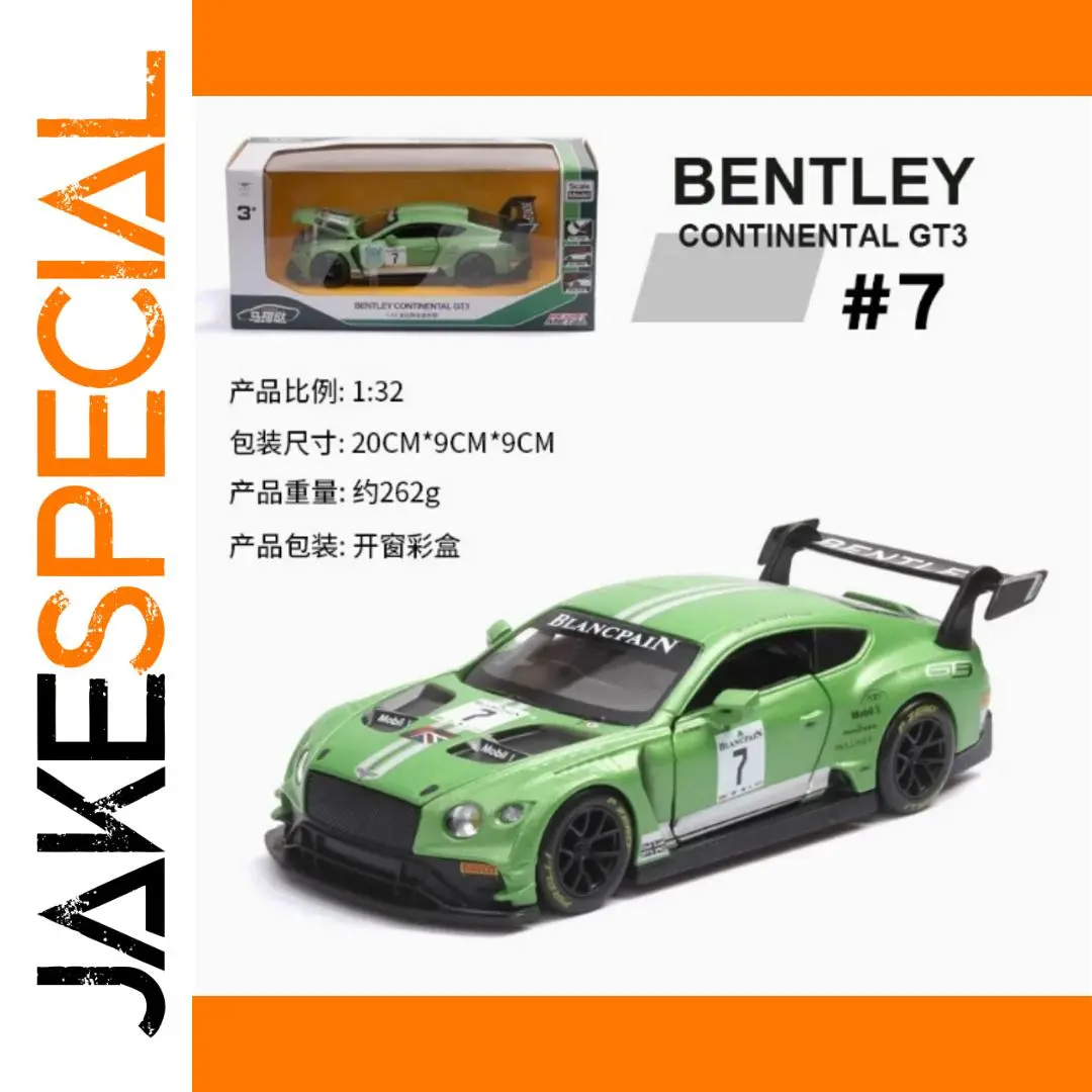 Experience the thrill of racing with this detailed diecast model of the Bentley Continental GT3, scaled perfectly at 1:32 for collectors and racing enthusiasts. Crafted from high-quality alloy and plastic, this sleek and aerodynamic miniature captures the luxurious sports car’s essence, from its prominent front grille to the large rear wing. Its vibrant green finish is glossy and realistic, complemented by black accents on the grille, wheels, and aerodynamic features. The dark-tinted windows and racing decals, including a white stripe down the center and the number 7 on the door, evoke the exhilarating spirit of motorsport. Whether displayed or played with, this model embodies both elegance and high-performance design, making it a captivating addition to any collection or child's toy set.