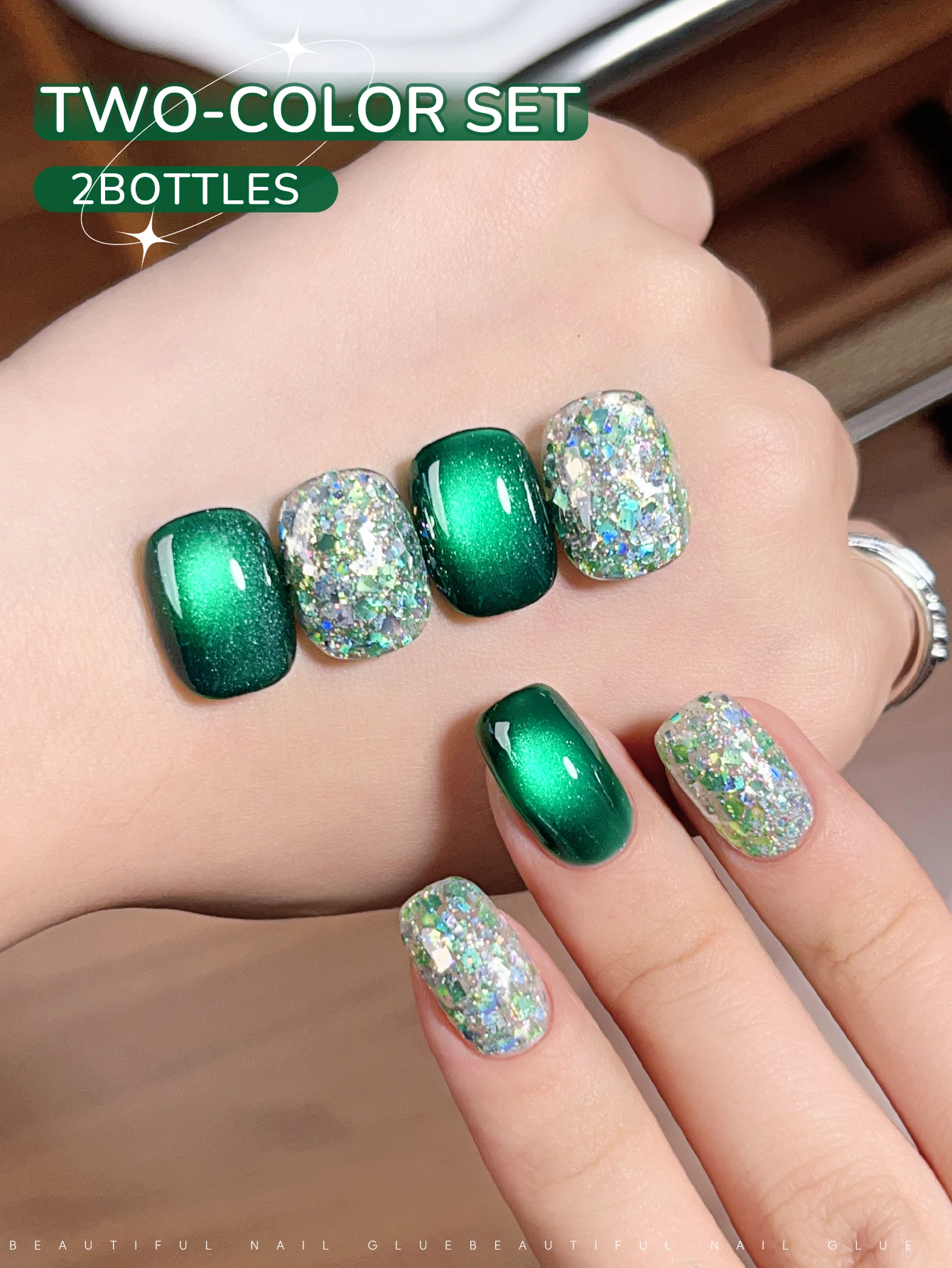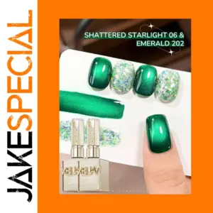Transform your nail art with this duo of 15ml green cat eye gel nail polishes, perfect for UV and LED soak-off applications. These semi-permanent gels offer a stunning gradient effect, transitioning from darker tips to luminous near the cuticles, complemented by holographic glitter accents with iridescent multi-colored flakes. Crafted with high-quality ingredients such as acrylates/carbamate copolymer, acrylates/vp copolymer, and dimethicone, they are free of high-concern chemicals, ensuring a safe and durable finish. Suitable for DIY enthusiasts and salon professionals alike, each set provides 30ml of vibrant, shimmering green gel polish to elevate your nail artistry with a luminous, glamorous look.