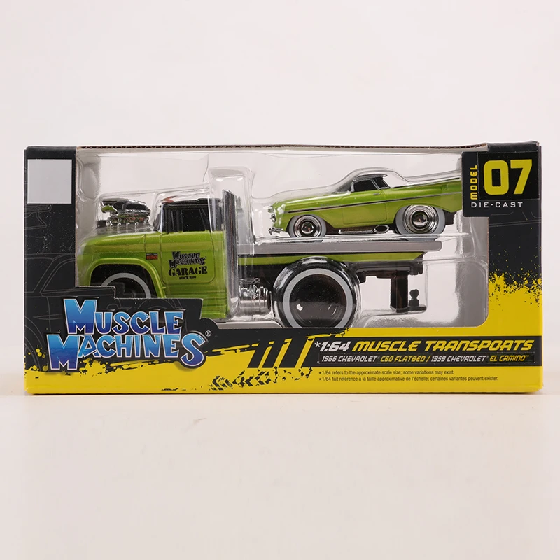 Experience the realism of these detailed diecast model cars, scaled at 1:64 and crafted from durable metal. The set features a vibrant metallic green 1966 Chevrolet C60 flatbed truck with a highly detailed cab, silver flatbed with raised edges, and authentic features like a prominent front grille, rectangular headlights, side mirrors, and a vertical exhaust pipe. Accompanying it is a sleek 1959 Chevrolet El Camino with an elongated body, black roof, integrated headlights, and chrome accents, showcasing fine detailing on silver rims and treaded tires. Perfect for collectors, these models are non-electric, suitable for ages 14+, and offer a striking display of classic automotive design.