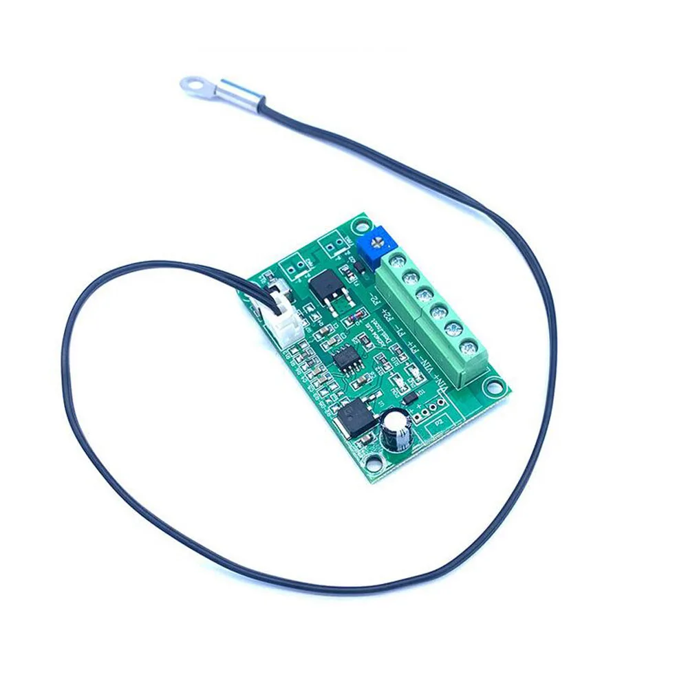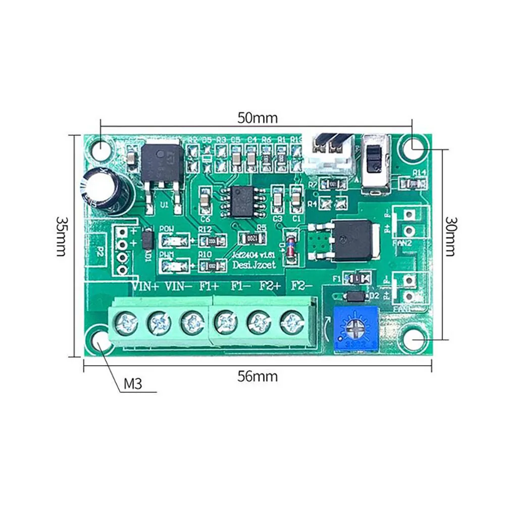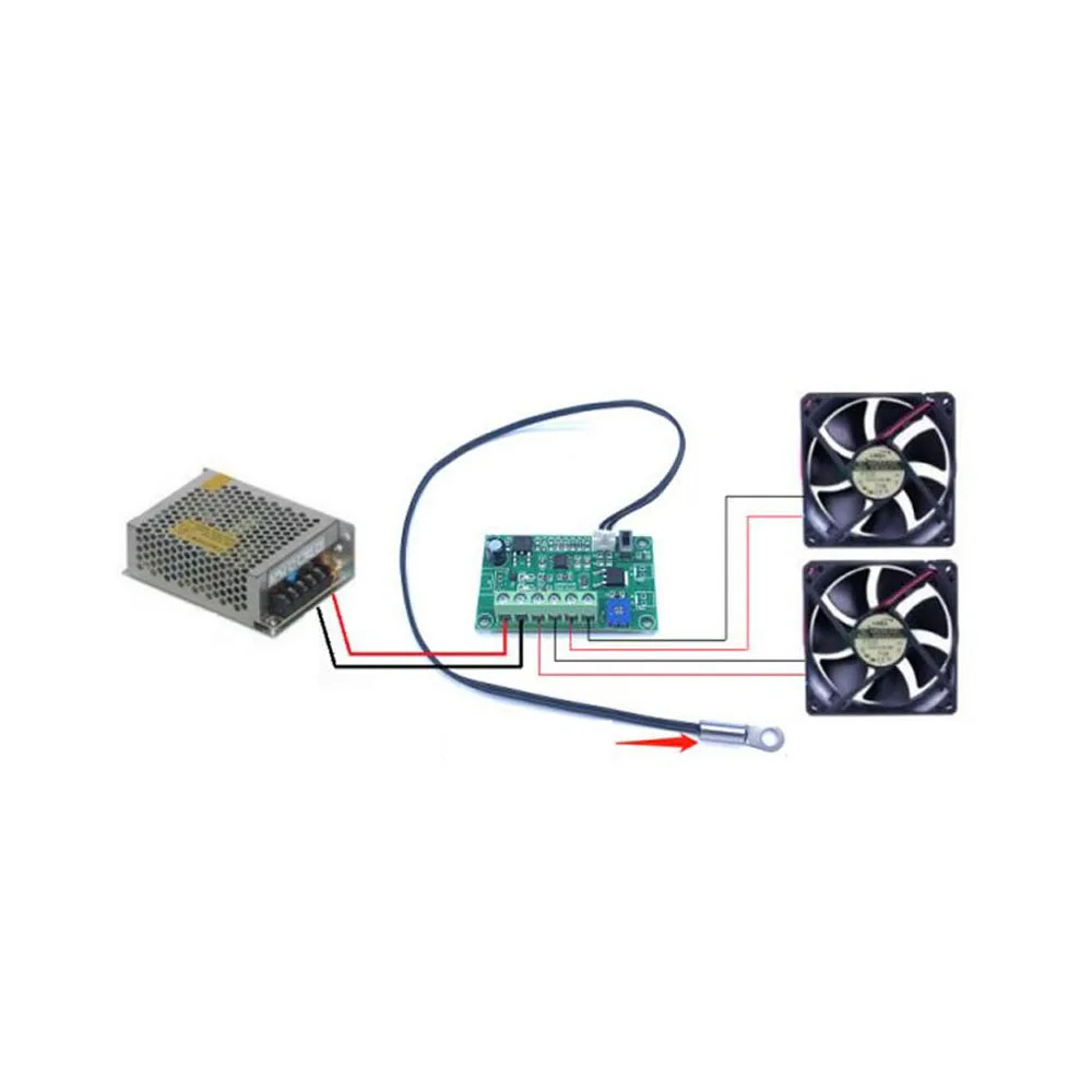 Enhance your cooling system with this high-performance fan temperature control governor. Designed in a sleek, rectangular green circuit board, it offers precise temperature-based fan regulation. Compact and organized, it features clearly labeled connection ports for easy wiring of power, fans, and sensors. Its robust design supports both 12V and 24V DC input voltages and can handle currents up to 4A. Equipped with PWM modulation technology, it ensures accurate speed control based on ambient temperature, making it ideal for industrial or high-performance environments. The integrated LED indicators provide real-time operational status, giving you complete oversight. Its versatile support for 2-wire, 3-wire, and 4-wire fans, including PWM and brushless types, allows seamless integration into existing systems, ensuring efficient cooling with minimal noise and optimal performance.
