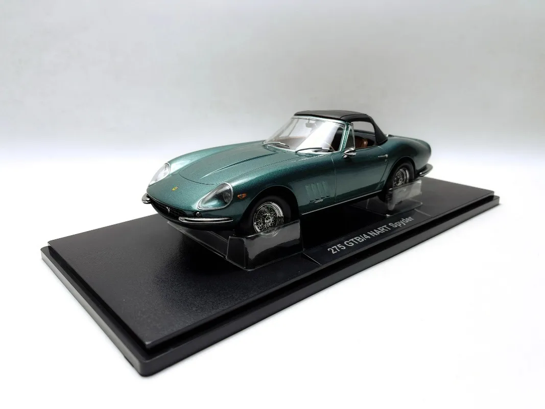 Experience the elegance of this highly detailed 1:18 scale die-cast Ferrari 275 GTB/4 model, perfectly crafted for collectors and enthusiasts alike. Finished in a striking metallic green, it captures the vintage charm and aerodynamic grace of the original sports car. The smooth, curved body showcases authentic accents such as chrome wire-spoked wheels, precise tail lights, and a sleek front grille with a yellow Ferrari emblem. The convertible roof is down, offering a view into a meticulously detailed interior with brown or tan upholstery, making it ideal for display or collection. Its compact size and superior craftsmanship make this model a captivating decorative piece and a treasured gift for passionate car lovers.
