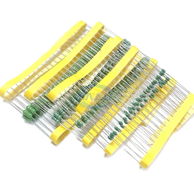 Enhance your electronic projects with this reliable set of 50 green fixed inductors, rated at 0.5W. Designed with a sleek cylindrical shape, these inductors feature a vibrant green body with a smooth matte finish. Arranged precisely in a single row within clear plastic holders accented by bright yellow edges, they offer an organized and professional appearance. The slender, silver metallic leads extend downward, ensuring easy through-hole mounting on various circuit boards. With inductance values spanning from 1.8μH to 3.3mH—including common values like 10μH, 22μH, and 220μH—this set provides versatility for different electronic applications. Ideal for power regulation, filtering, and RF circuits, these inductors combine aesthetic appeal with technical reliability. Trust these components to elevate your electronic design projects efficiently and confidently.