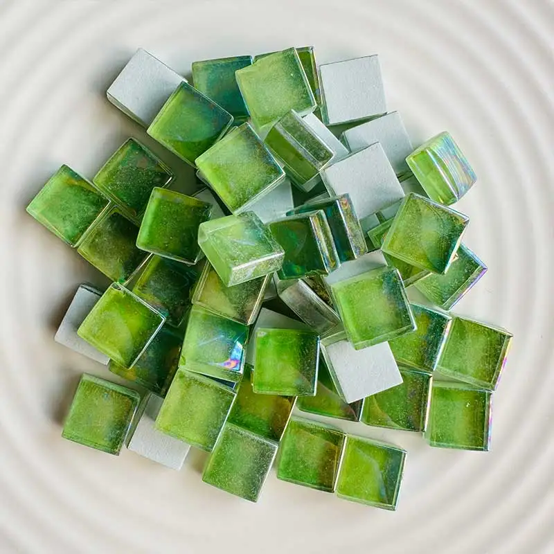 - Contains 100 grams of assorted square glass mosaic tiles in a spectrum of green shades from dark to light, perfect for vibrant and natural project designs.