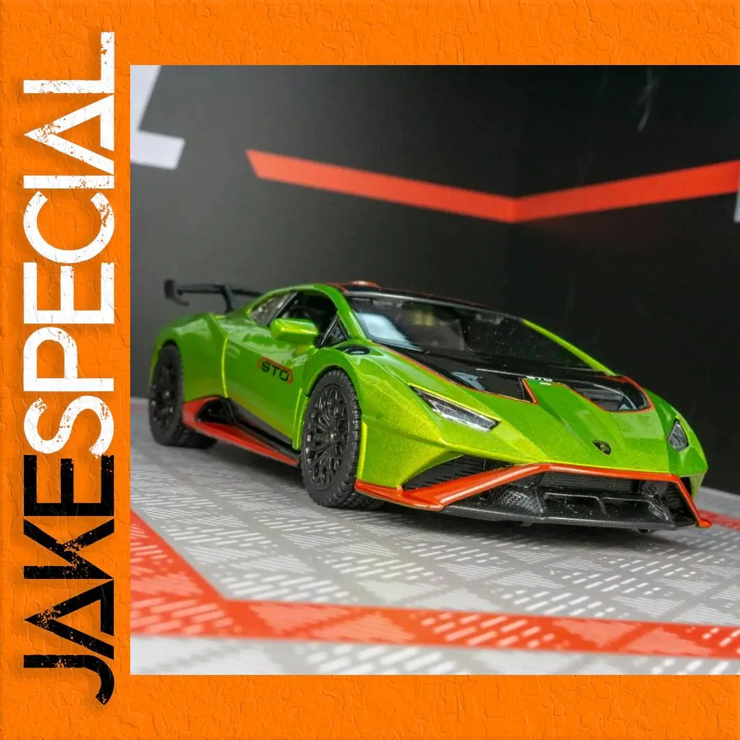 - This 1:32 scale Lamborghini STO model features a vibrant green, glossy finish with black and orange accents enhancing its aerodynamic styling. Its high detail makes it a standout collectible piece.
