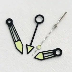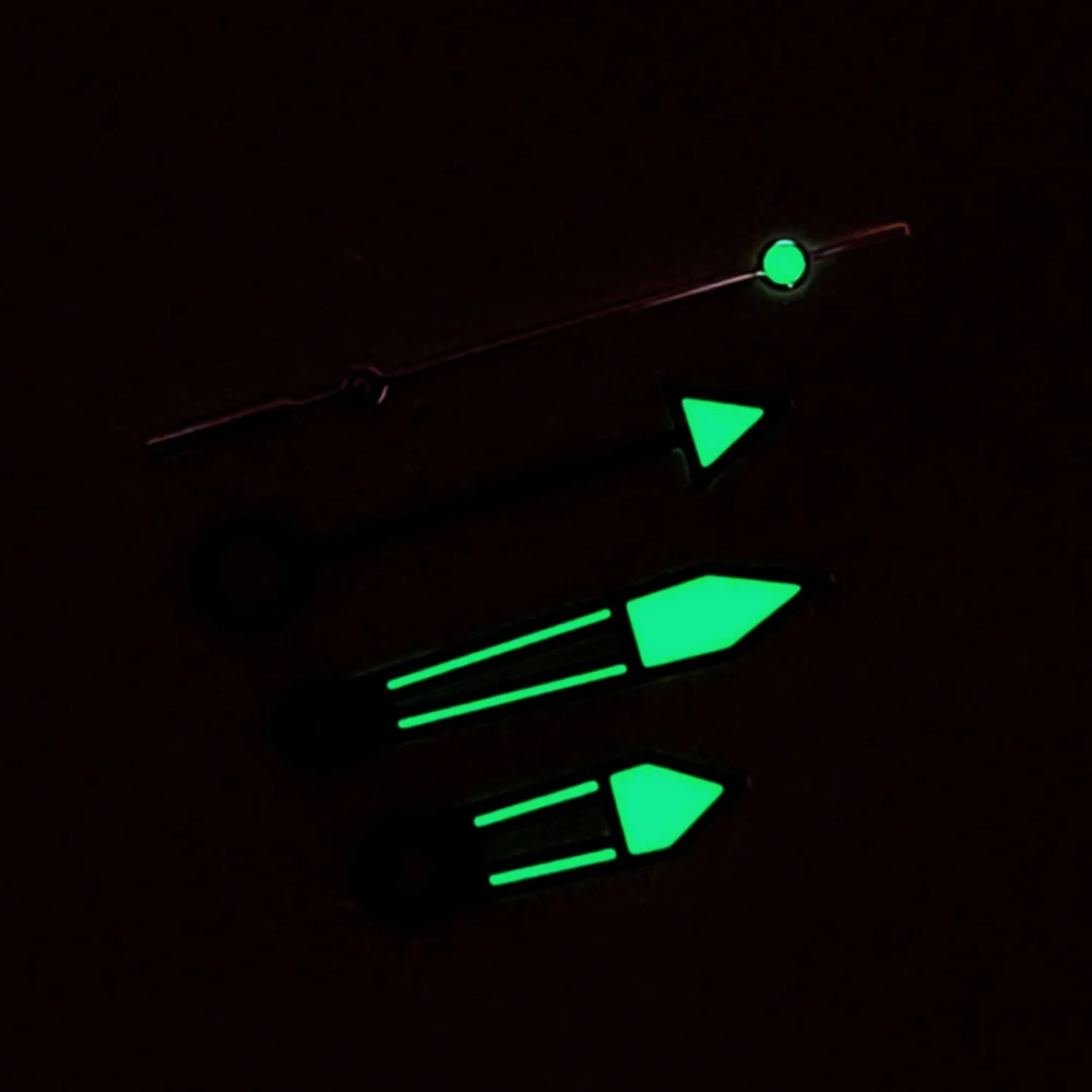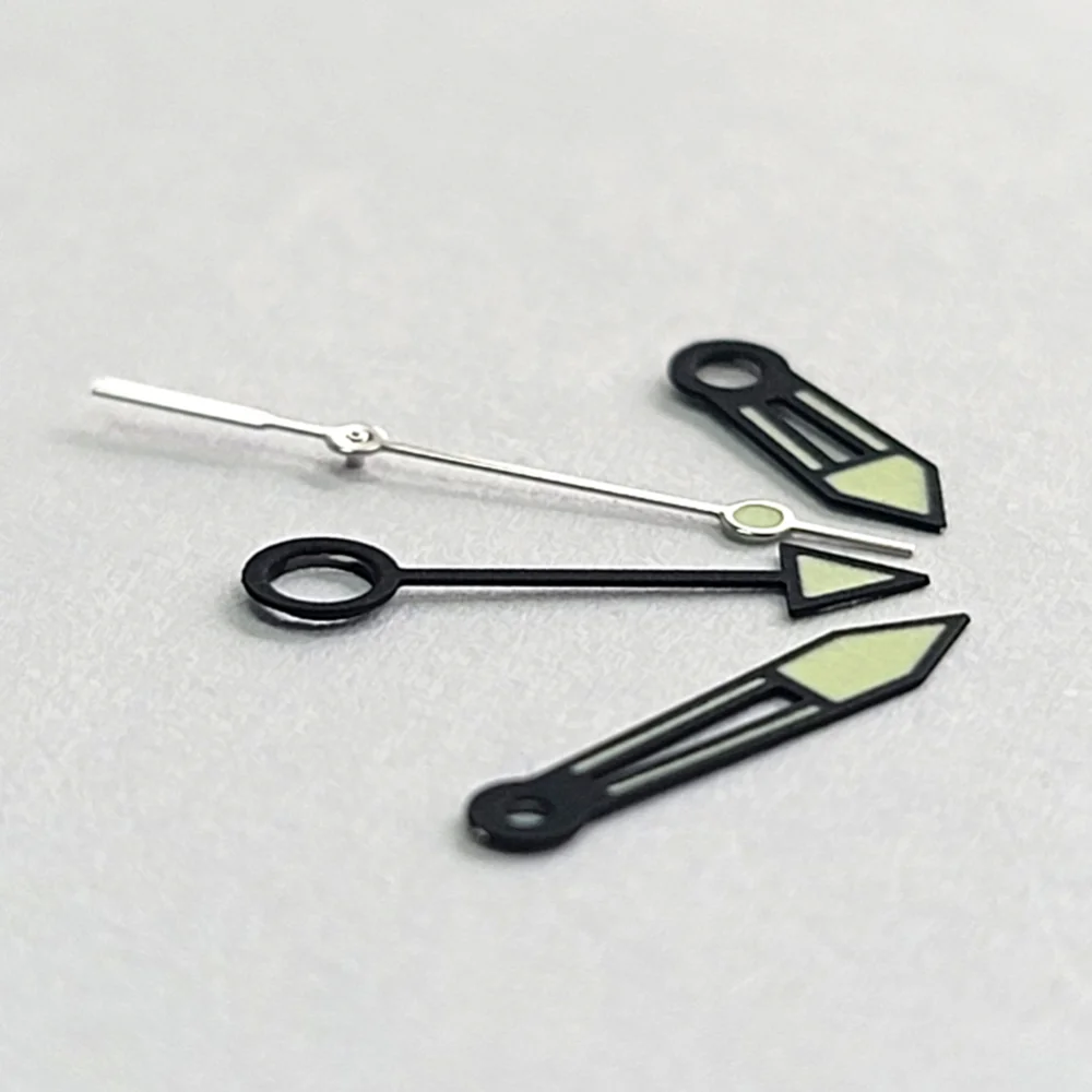 Enhance your NH34 movement with this high-quality four-hand set featuring sleek black outlines and vibrant green luminous tips for visibility in low light. The set includes an hour hand (9.5mm or 8mm options), minute hand (14.5mm or 12mm), second hand (15.5mm or 12.5mm), and a stubby GMT hand (15.5mm or 12.5mm), all crafted for precise fit and stunning aesthetic. The skeletonized hour hand adds a modern touch, while the slender second and minute hands ensure accuracy. Designed specifically for Japanese NH34 movements, these hands combine excellent functionality with a stylish look to elevate your watch’s appearance and performance.