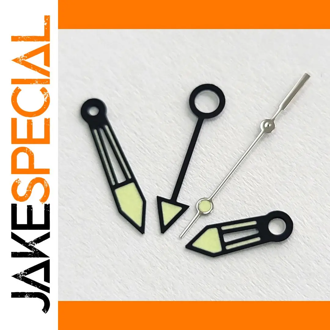 Immerse yourself in precision and style with this set of four luminous watch hands designed specifically for the Japanese NH34 movement. Crafted with meticulous attention to detail, these hands feature vibrant green luminous tips for clear visibility even in low-light conditions. The set includes an arrow-shaped hour hand, a sleek second hand, a slender minute hand, and a robust GMT hand with a wide triangular luminous tip, all constructed with sharp, clean lines and precise cutouts. Available in two size options to perfectly match your watch's specifications, these hands will seamlessly elevate the appearance of your timepiece. Designed for easy installation, they ensure reliable performance and a striking aesthetic for your NH34-powered watch.
