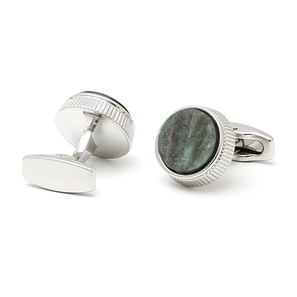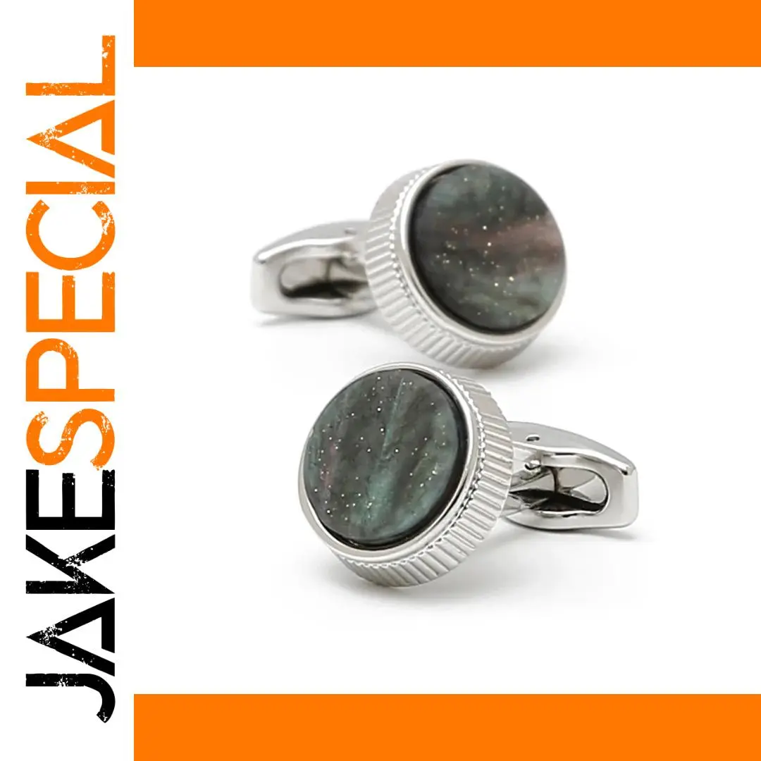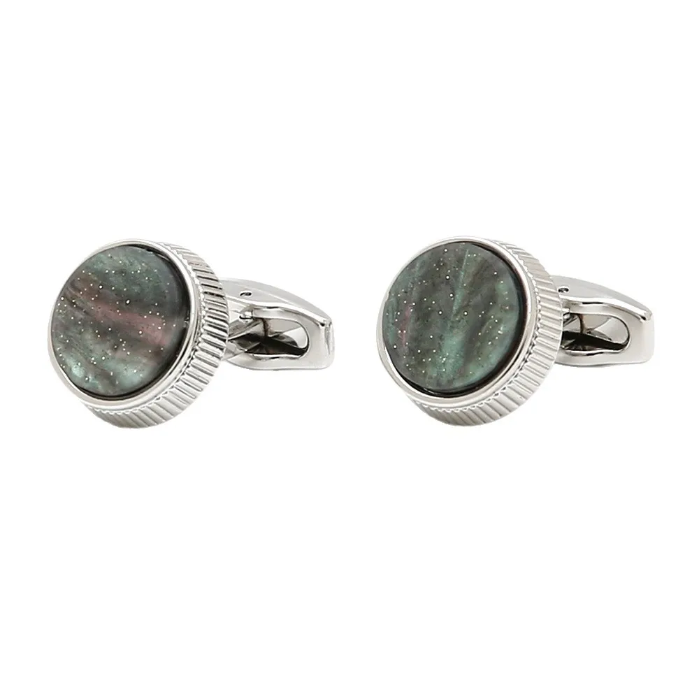 Imagine elevating your style with these stunning cufflinks that combine vintage charm with modern sophistication. Featuring a striking round design, each piece showcases a lush green marble pattern with swirling dark and light green hues, accented by tiny golden speckles reminiscent of stars. The glossy, polished surface enhances the natural veining and intricate detailing of the stone, creating an effect that’s both eye-catching and refined. Encased in a textured, ribbed metal bezel with a shiny silver-tone finish, these cufflinks strike the perfect balance between elegance and durability. Versatile in style, they're ideal for a range of fashion statements—from minimalist to retro, from gothic to trendy. A seamless addition to any formal or casual wardrobe, these cufflinks embody timeless style with a unique artistic touch.