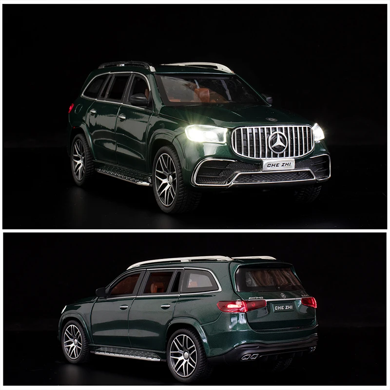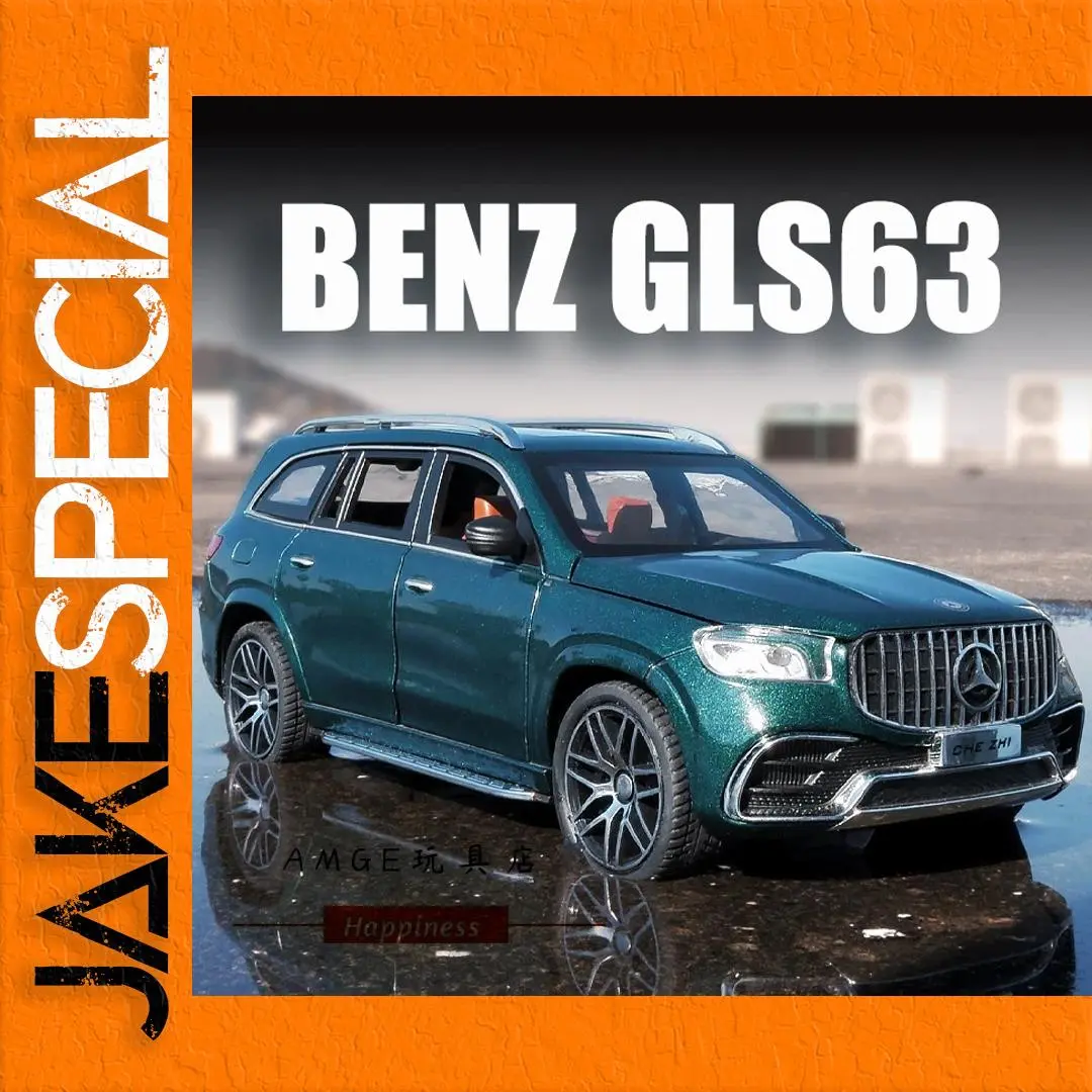 Immerse yourself in luxury with this 1:24 scale diecast model of the Mercedes Benz GLS63 AMG SUV, crafted from durable metal and plastic. Featuring a vibrant metallic green high-gloss finish, it showcases detailed sculpting, clear headlights with internal detailing, black grille accents, side mirrors, and door handles. Equipped with functional sound and light features operated by batteries, the model also boasts silver multi-spoked wheels with treaded tires for added realism. Perfect for adult collectors, this finely crafted replica measures approximately 1:24 in scale, capturing the vehicle’s authentic proportions and luxurious design, making it an impressive centerpiece for automotive enthusiasts.