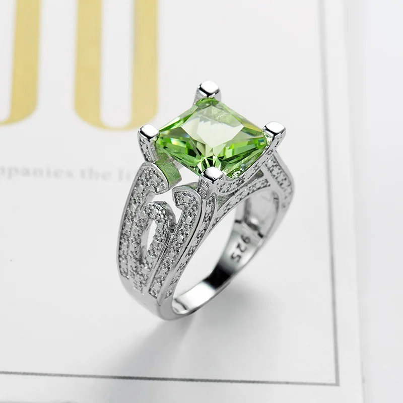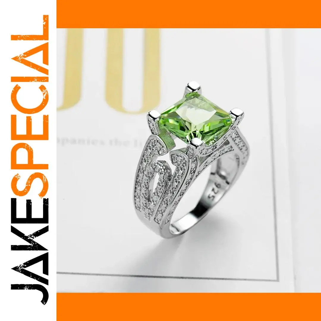 Elevate your style with this luxurious women’s cocktail ring featuring a striking square-shaped green zircon gemstone set in a platinum-plated silver-tone band. Weighing approximately 5 grams, it offers a comfortable yet substantial feel, available in US sizes 6, 7, 8, 9, and 10. The intricate prong setting highlights the vibrant, faceted green zircon, which reflects light brilliantly for an eye-catching effect. Crafted from durable gold-filled jewelry, this classic design with ornate swirling details and embedded clear crystals exudes elegance, making it perfect for engagements, weddings, or special celebrations. Discover timeless sophistication with this stunning statement piece.