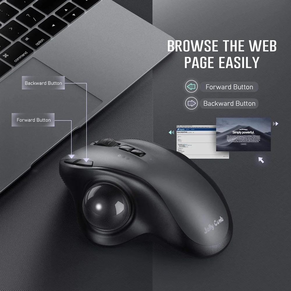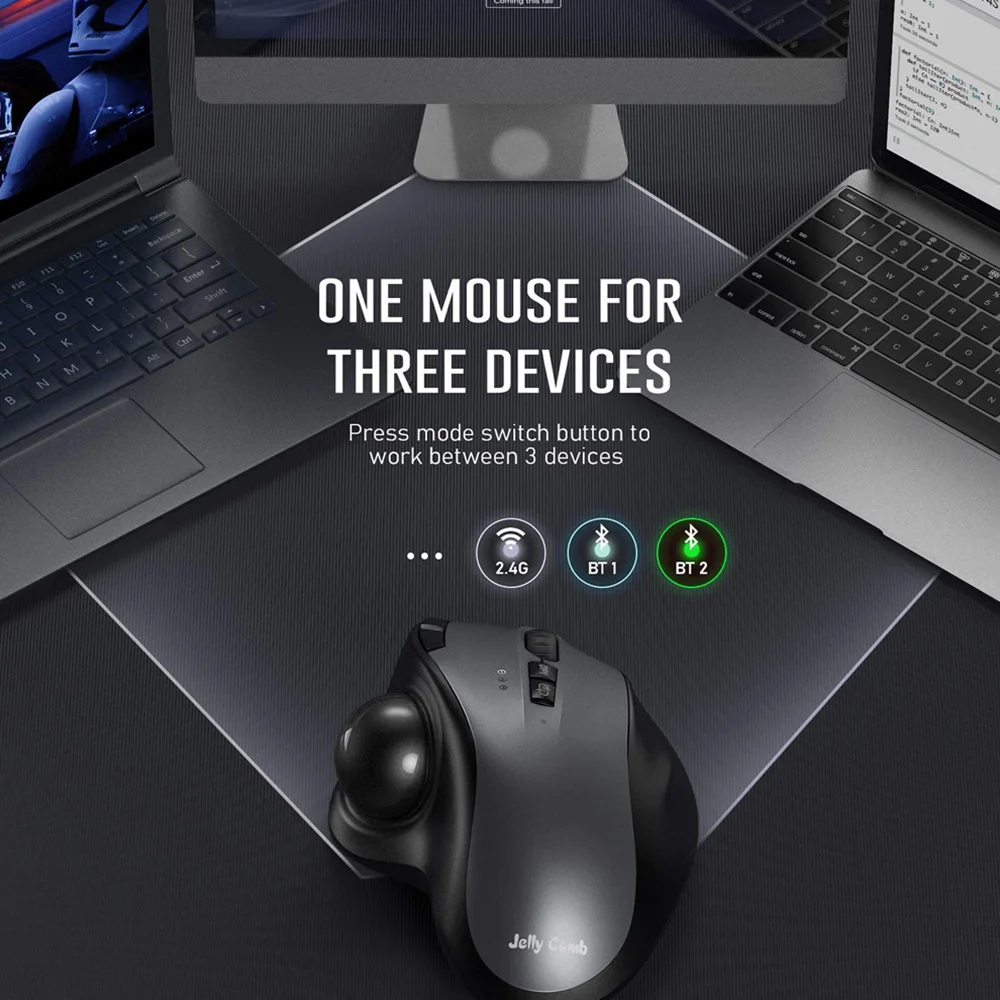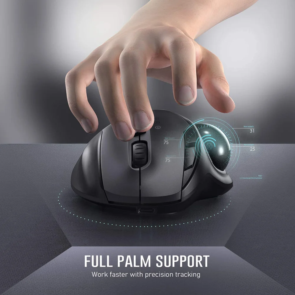 Experience seamless navigation with this ergonomic gray wireless trackball mouse, designed for right-handed use. It features a prominent, textured teal trackball with a glowing geometric pattern, controlling cursor movement without arm movement to reduce fatigue. The mouse supports dual connection modes—Bluetooth 4.0 and 2.4G USB—allowing connection to up to three devices within a 10-meter range. Equipped with 8 buttons and three adjustable DPI levels (1000/1600/2400), it offers customizable sensitivity for precise, fast tracking. Powered by a 600mAh rechargeable lithium battery via USB-C, it provides about one month of use per charge. Its sleek, modern design and reliable connectivity make it an essential tool for professional and everyday use.