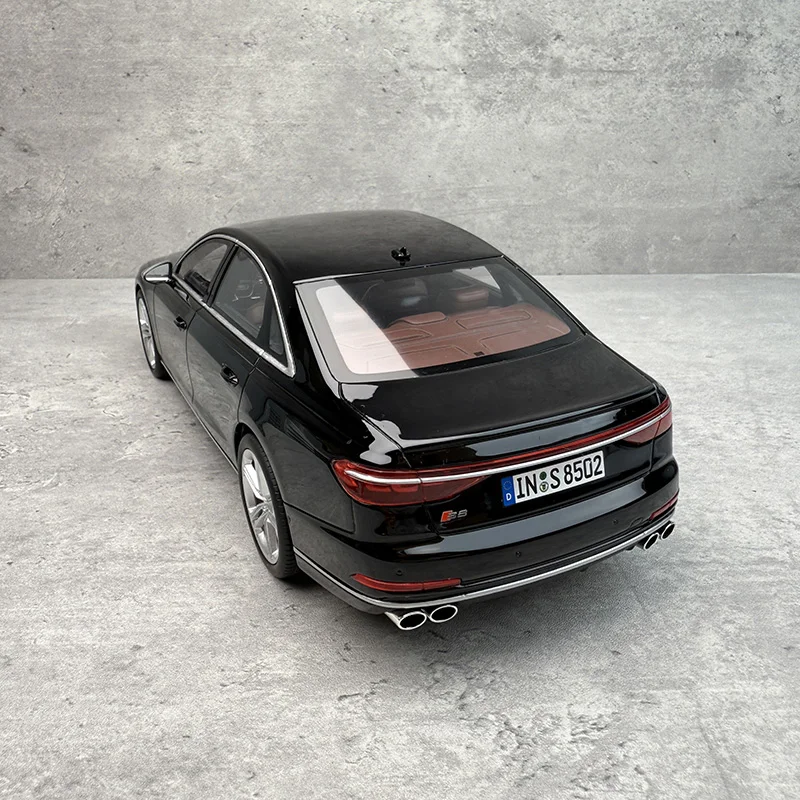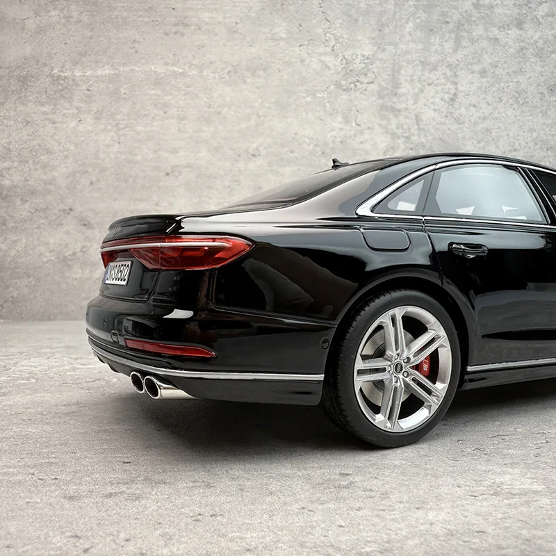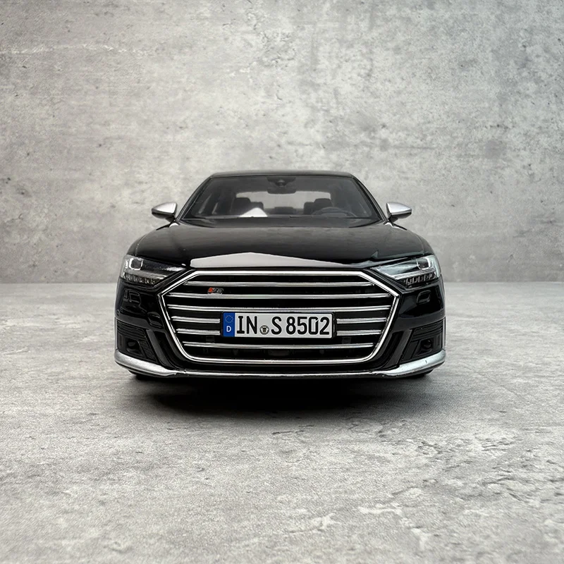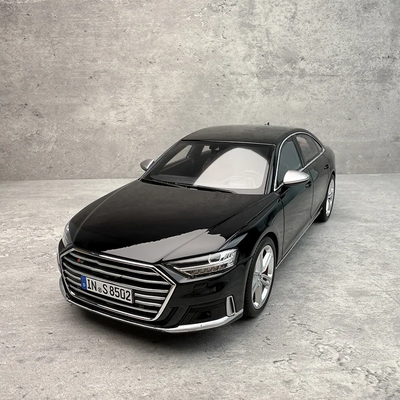 Experience the sophistication of this 1:18 scale resin collectible model of a luxury sedan in Mythical Black. Crafted with high detail for adult collectors, this finished, non-electric model features a sleek, aerodynamic silhouette, wide grille with horizontal chrome slats, angular LED headlights, chrome window and door handle accents, and sporty silver multi-spoke alloy wheels with visible brake calipers. Its glossy black finish enhances its premium appearance, making it an elegant display piece. Suitable for ages 14 and above, this static model captures the upscale design of the original vehicle, making it an ideal addition to any car collection or a distinguished gift for automotive enthusiasts.