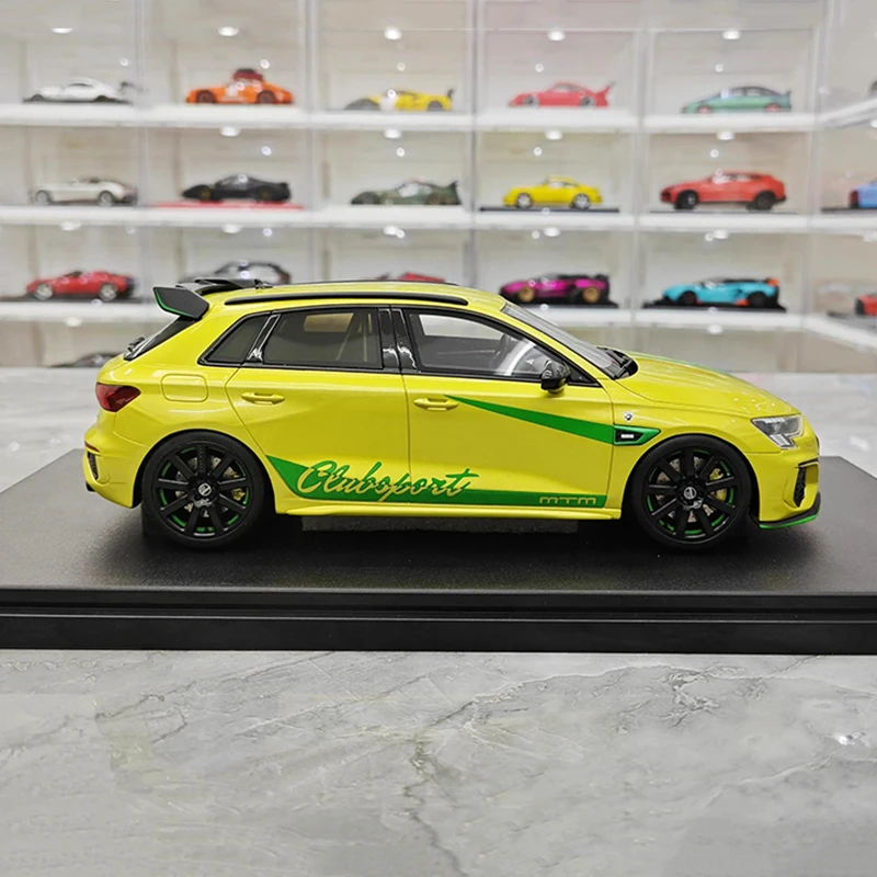Immerse yourself in the thrill of automotive craftsmanship with this highly detailed GT Spirit S3 MTM diecast model. Crafted from premium resin, it measures approximately 26 cm in length, 10 cm wide, and 9 cm tall, perfectly sized for display. The vibrant luminous yellow body with a glossy finish highlights its sleek curves and sporty silhouette, enhanced by bold green side stripes and the “Chubasco” script, making it an eye-catching centerpiece. The model's authenticity is brought to life through black multi-spoke wheels, realistic tires, and detailed brake calipers, paired with a honeycomb grille, LED-style headlights, and black accents around the bumpers and window trim. Its aerodynamic features, including a rear spoiler and side skirts, exude a racing-inspired vibe ideal for collectors and enthusiasts seeking precision and style.