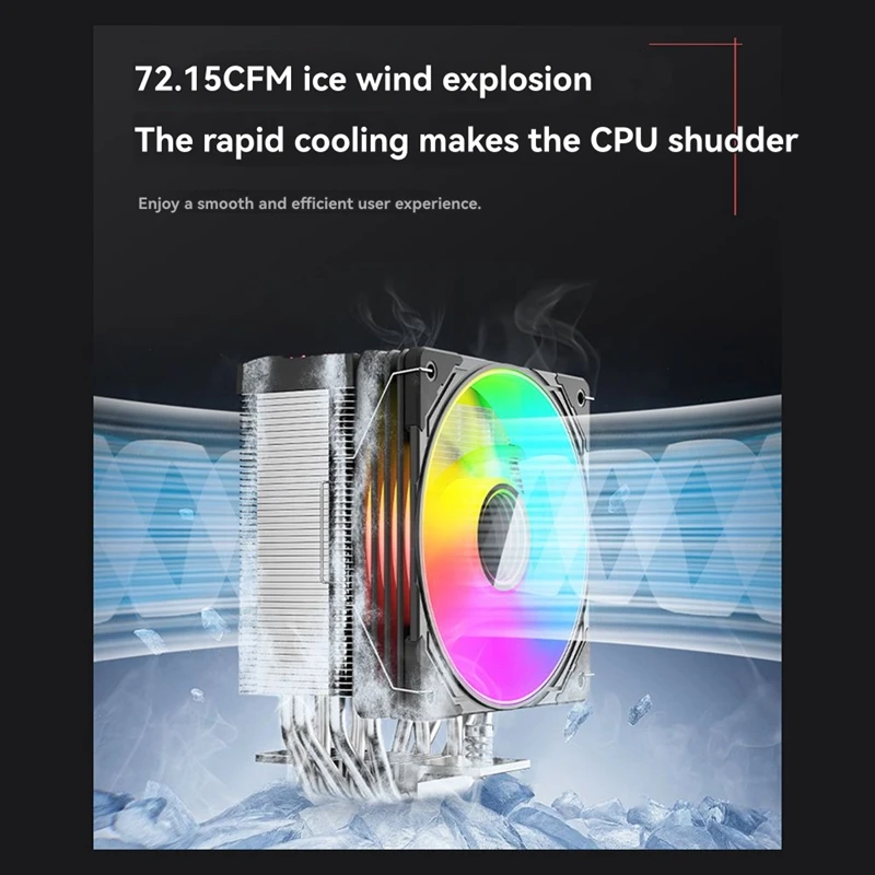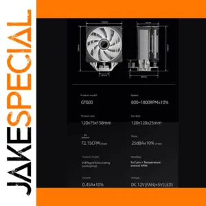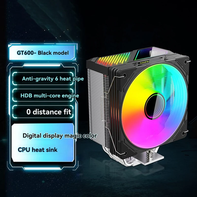 Experience the perfect blend of modern design and high-performance cooling with this GT600 CPU air cooler. Its compact 120x75x158mm size fits a variety of builds, while the 120x120x25mm PWM fan provides dynamic airflow from 800 to 1800 RPM ±10%. Crafted with six advanced heat pipes and a copper base, it ensures rapid heat transfer and optimal thermal management. The cooler’s 0.4mm thick fins, separated by golden-colored spacers, enhance airflow efficiency and reduce turbulence for quieter operation. A modern ARGB top cover adds vibrant lighting effects synchronized with your system. With a real-time chassis temperature display and multiple power interfaces, this cooler combines technical prowess with stylish aesthetics, making it an ideal choice for enthusiasts seeking both performance and visual appeal in their PC build.
