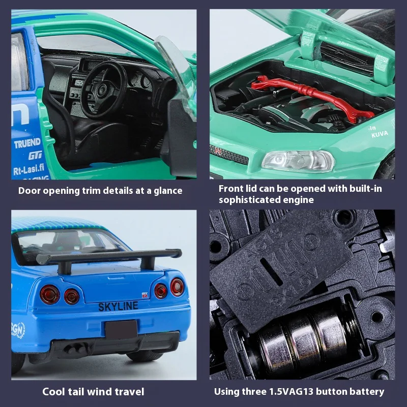The GTR alloy model car is a stunning die-cast replica crafted from high-quality zinc alloy, available in elegant glossy black, vibrant blue, and striking green. Designed to enhance your car’s center console or serve as a unique desktop ornament, this model showcases excellent detailing with bold “NISAN” branding and a sporty “36” racing number. Its sleek finish, accented by black wheels with red brake calipers and a prominent rear spoiler, embodies an aggressive aesthetic that auto enthusiasts will appreciate. This eye-catching piece makes a perfect gift for men who cherish automotive excellence and style.