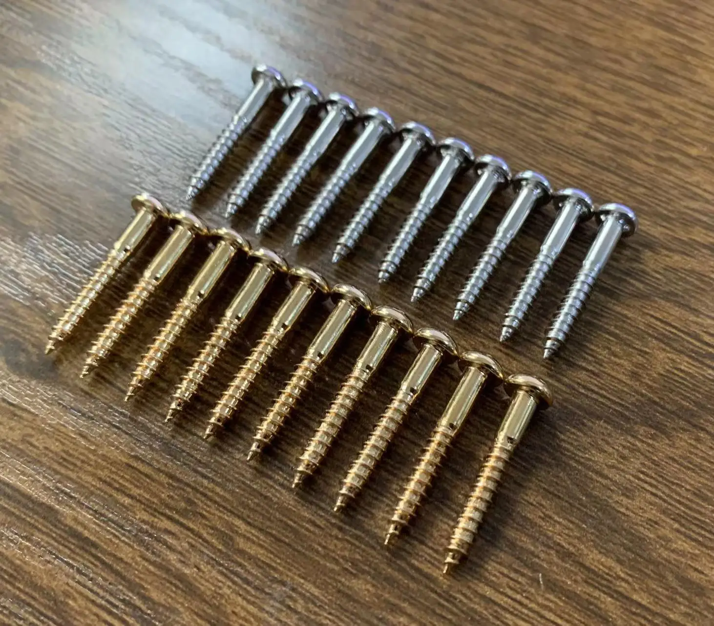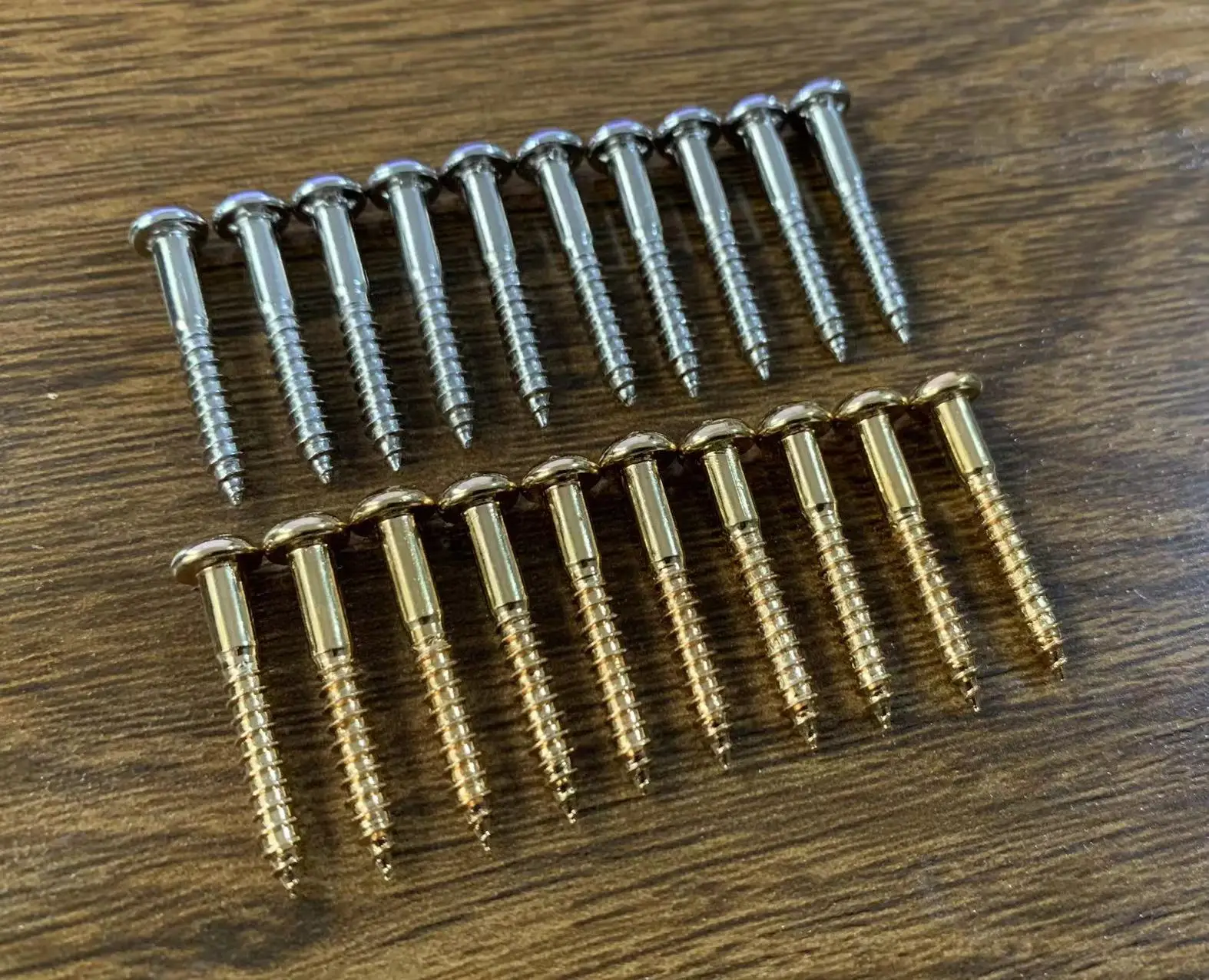 Imagine giving your electric guitar or bass a fresh, polished look with this high-quality screw set. The sleek, reflective finishes in chrome, gold, or black instantly elevate your instrument's aesthetic, adding a touch of sophistication and personality. Designed with precision, these screws feature rounded, domed heads and slotted drivers for effortless installation and a secure fit. Crafted from durable metal with a polished surface, they promise longevity and resistance to tarnishing. Whether you're replacing worn-out parts or customizing your gear, these screws provide a perfect blend of style and functionality. Easy to install, they help your guitar stay in top shape and look as good as it sounds.