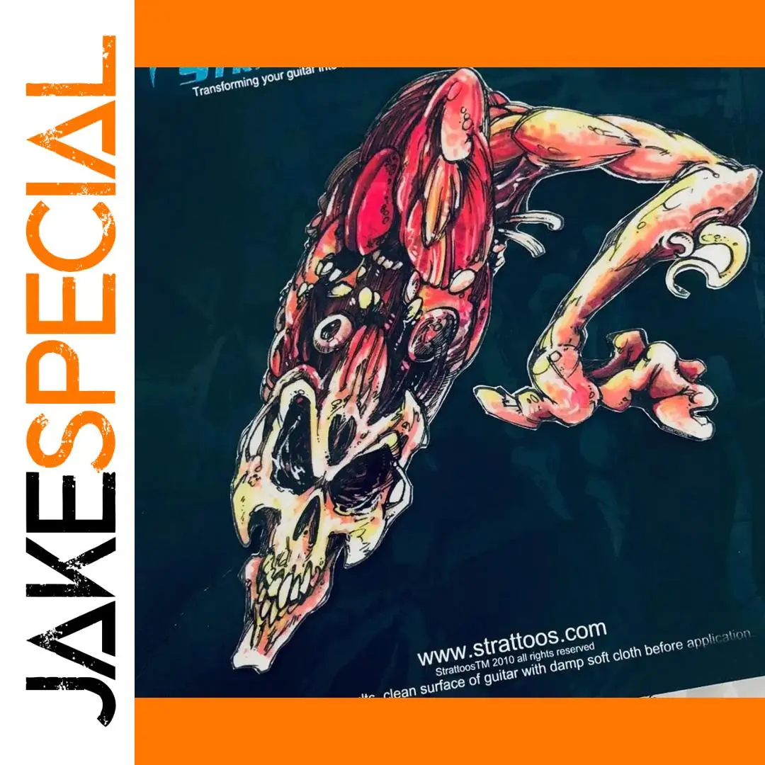 Imagine customizing your guitar with a bold, artistic decal that instantly transforms its appearance. This non-adhesive, high-quality decal features a striking design of a skull with menacing eye sockets, sharp teeth, and flowing organic shapes in vibrant reds, oranges, pinks, and muted beige and yellow tones accented with black shading. Designed to fit perfectly on both electric and acoustic guitars, it conforms to the instrument’s curves without damaging the finish. Easy to apply and remove within seconds, this decal allows you to personalize your guitar whenever you desire, adding depth and a fierce aesthetic. Made in the US, it’s a perfect way to showcase your unique style without the permanence of paint or adhesive decals.
