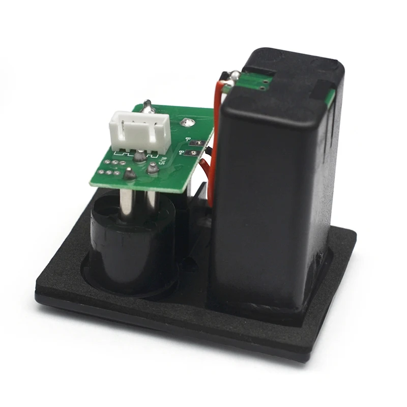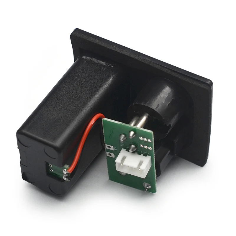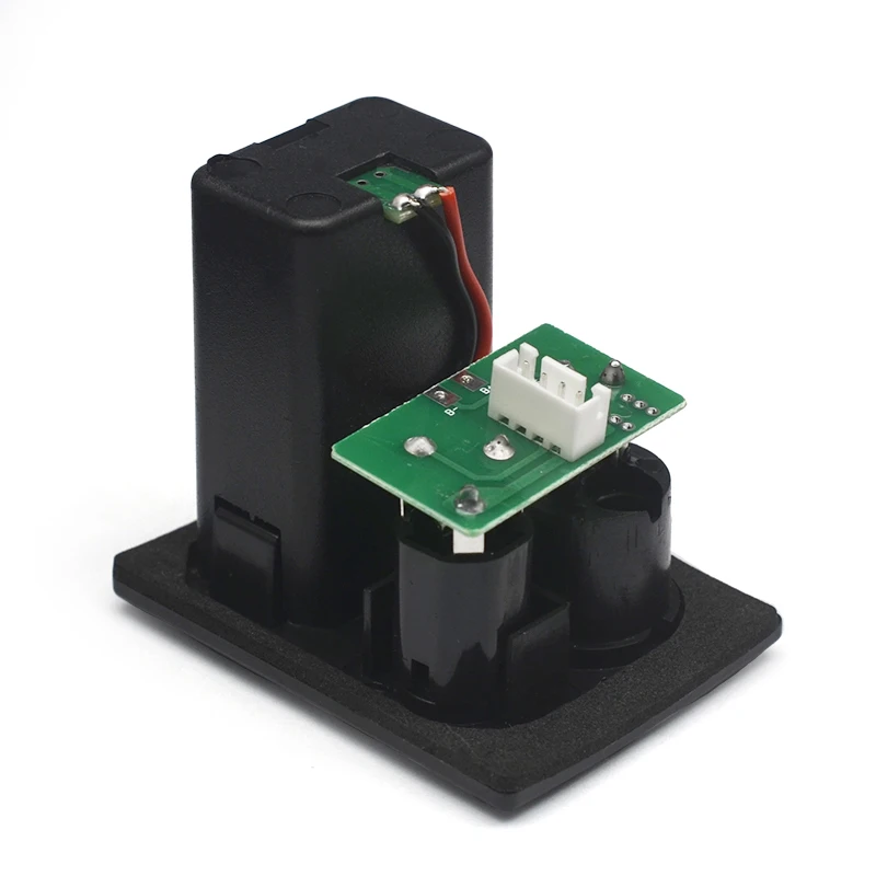 - Technical specifications include: lightweight design, compatibility with 9V batteries, four screw holes for mounting, 4-pin connection, and a compact rectangular shape for optimal fit.