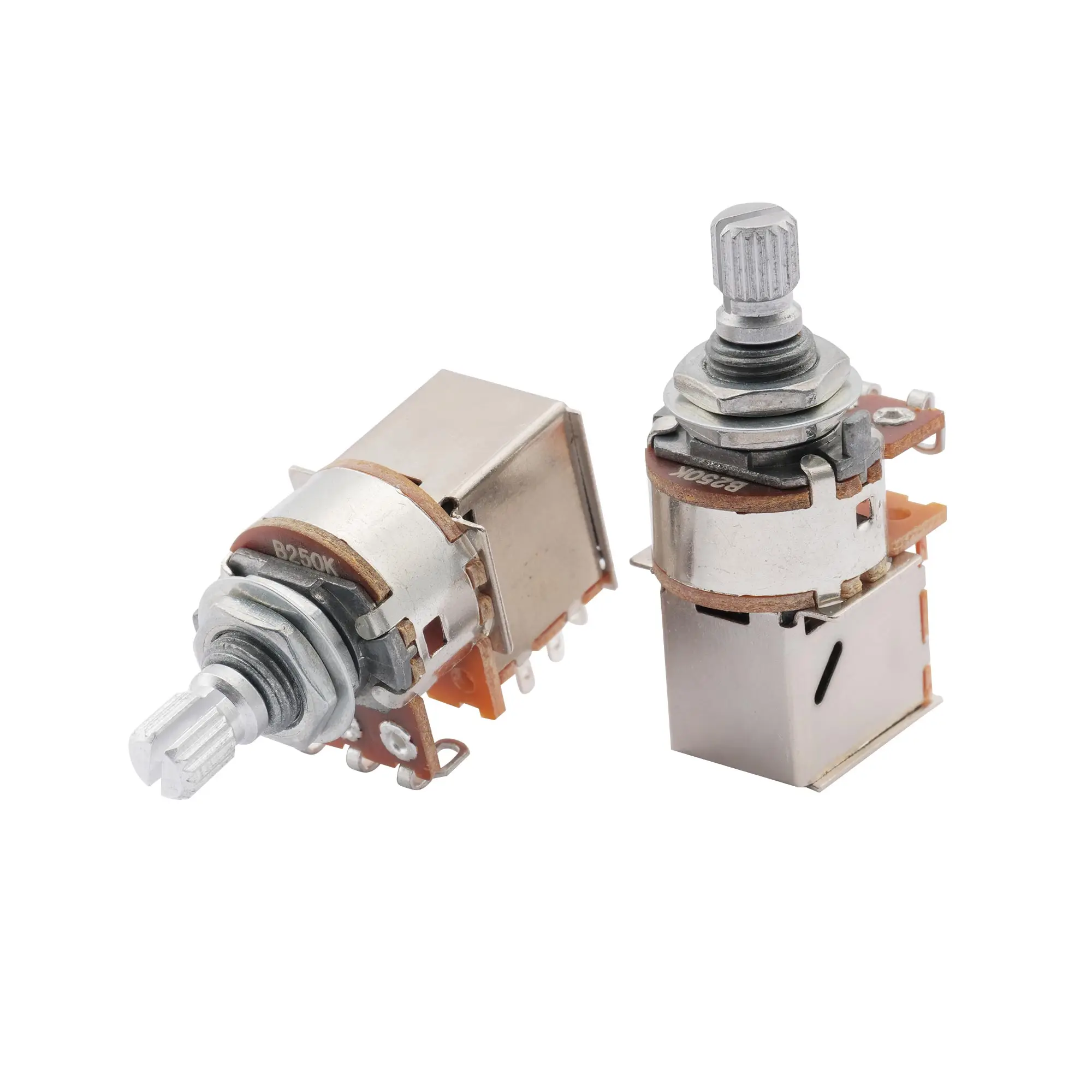 - Technical specifications include resistance values of 250K or 500K, taper type (audio or linear), thread dimensions, shaft diameter, and material composition, ensuring compatibility across a broad range of instruments.