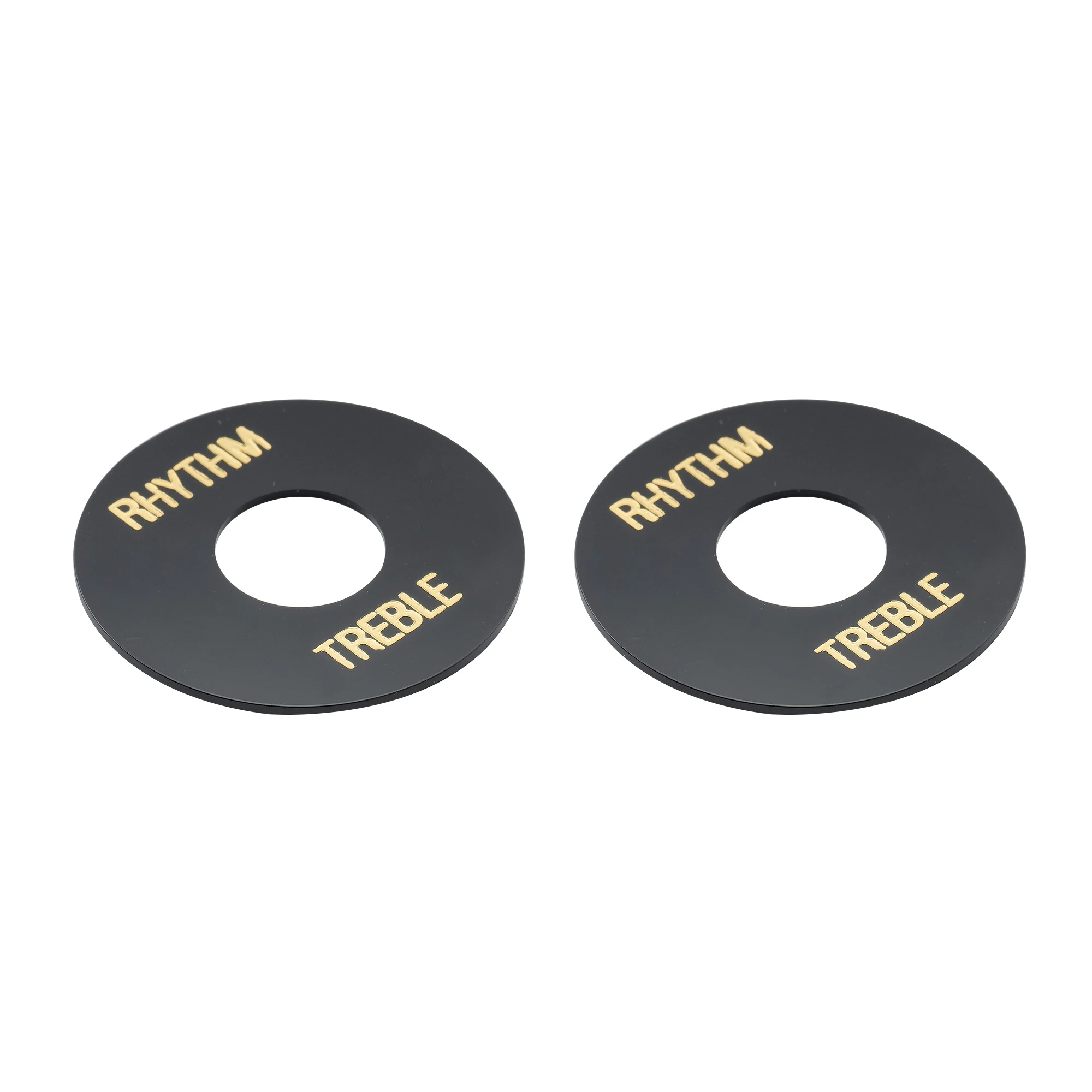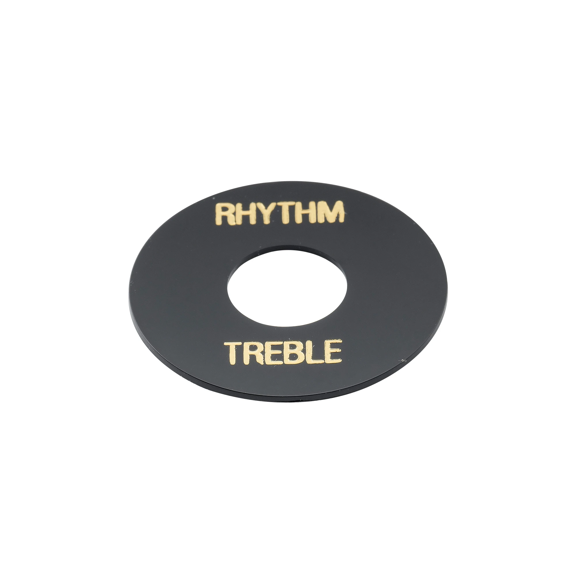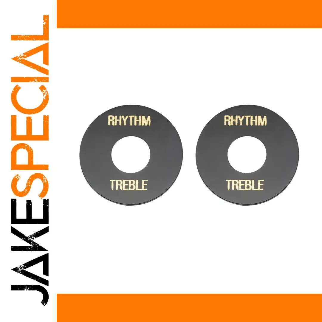 Enhance your guitar’s look with this set of two self-adhesive toggle switch plates, compatible with USA Les Paul and Epiphone models. Featuring a sleek circular design with an outer diameter of 34.4mm (1.354″) and a 13mm (0.512 inch) central hole, each plate is 1mm (0.039 inch) thick. Made from durable plastic, the plates are available in cream and black, with elegant gold-printed words “RHYTHM” and “TREBLE” for easy switch identification. Their simple application ensures a seamless fit, elevating your guitar’s aesthetic while providing functional labeling for your toggle switch area.