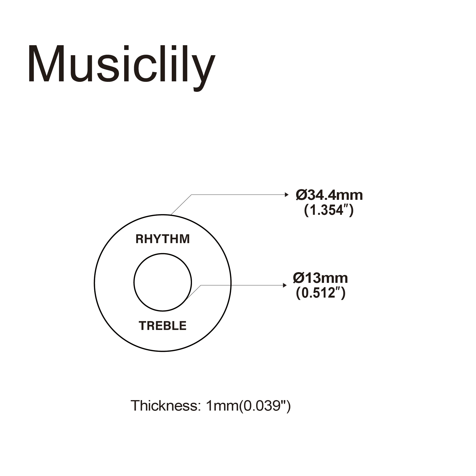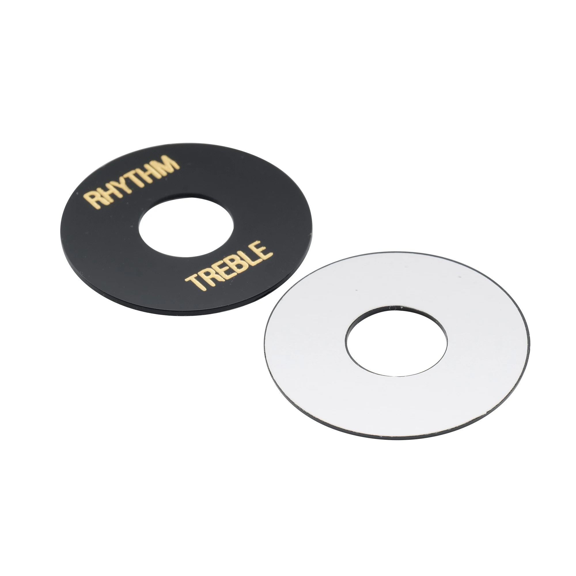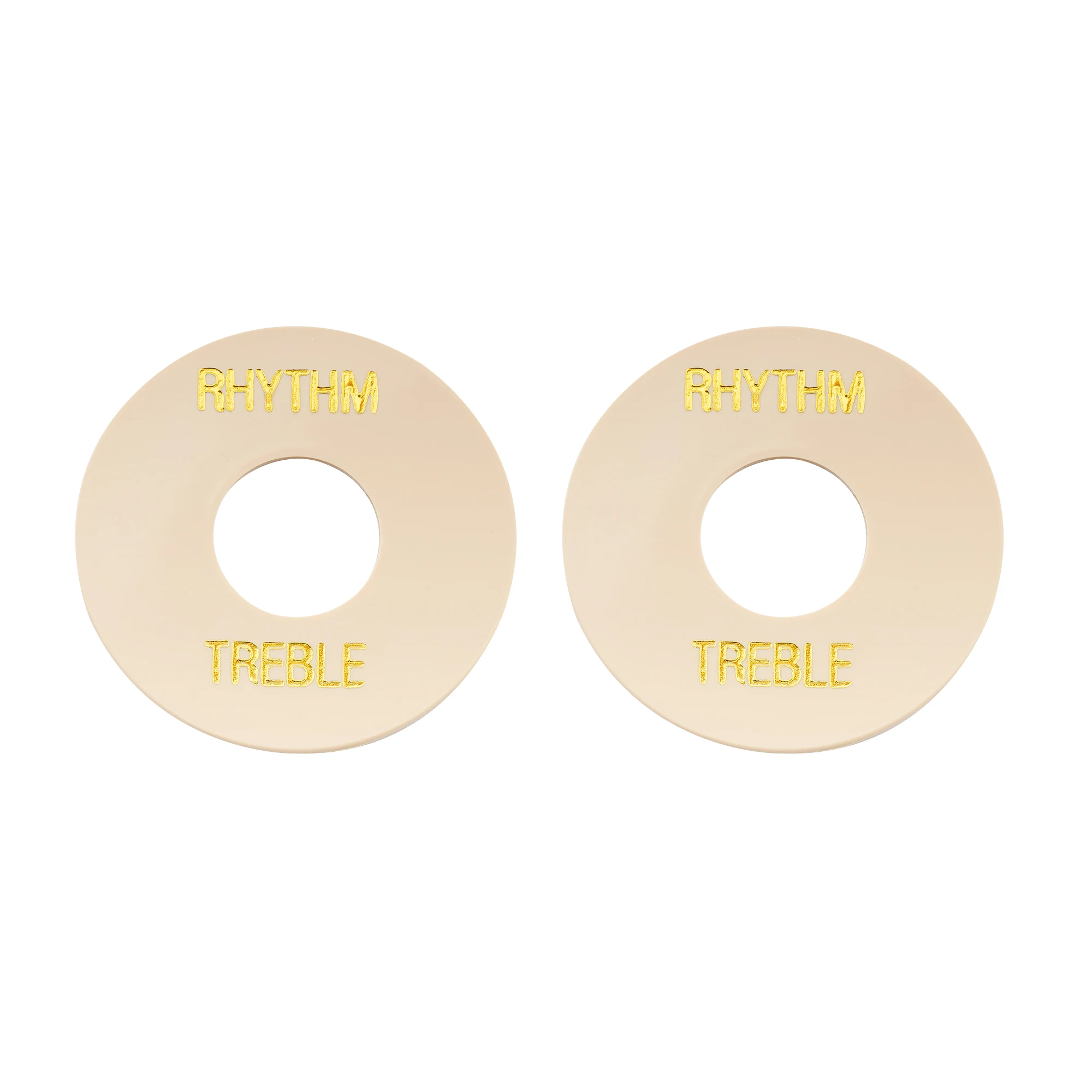 Enhance your guitar’s look with this set of two self-adhesive toggle switch plates, compatible with USA Les Paul and Epiphone models. Featuring a sleek circular design with an outer diameter of 34.4mm (1.354″) and a 13mm (0.512 inch) central hole, each plate is 1mm (0.039 inch) thick. Made from durable plastic, the plates are available in cream and black, with elegant gold-printed words “RHYTHM” and “TREBLE” for easy switch identification. Their simple application ensures a seamless fit, elevating your guitar’s aesthetic while providing functional labeling for your toggle switch area.