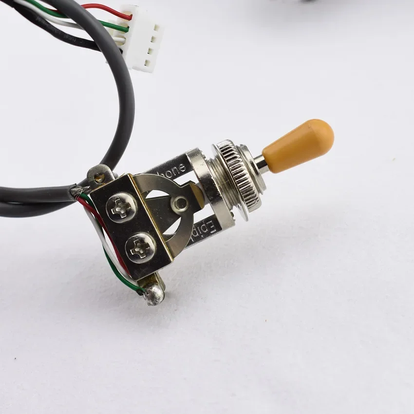 Elevate your guitar or audio equipment with the Original Genuine Epi Loaded Pre-wired Wiring Harness, expertly crafted in Korea. This comprehensive set includes three circuit boards, featuring four high-quality potentiometers for precise control over volume and tone, along with essential audio connectors for seamless integration. Featuring a stunning arrangement of colored wires and switches, this wiring harness ensures your musical creations sound their best. Whether you’re building or modifying audio devices, this pre-wired kit offers the reliability and functionality you need. Transform your projects with this essential component, expertly designed for serious enthusiasts and collectors.