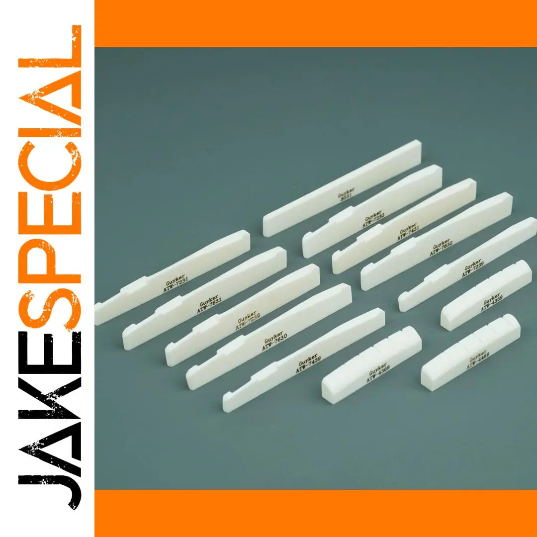 Elevate your acoustic guitar performance with this exquisite set of Guyker Acoustic Guitar Bone Bridge Saddles. Crafted from premium white cow bone, each saddle enhances resonance to deliver a richer, clearer tone. This collection includes 12 saddles, varying in design to offer versatility for different guitar models and playing styles. The notched and flat ends ensure perfect string height adjustments, catering to your unique playing needs. Embrace the artistry of music with saddles that not only provide functionality but beautifully complement your guitar's aesthetic as well.