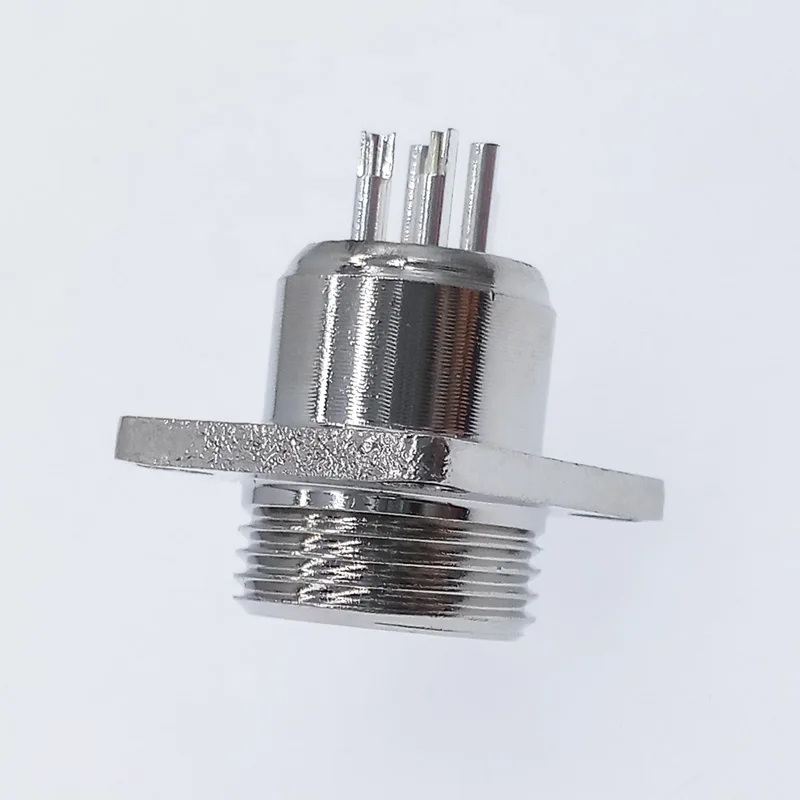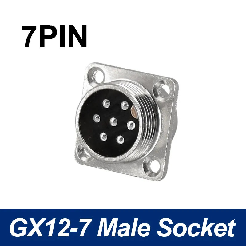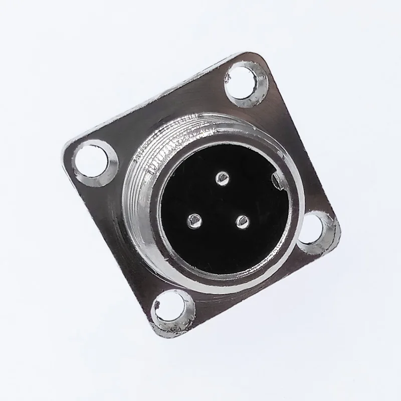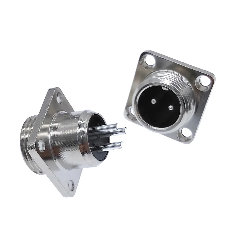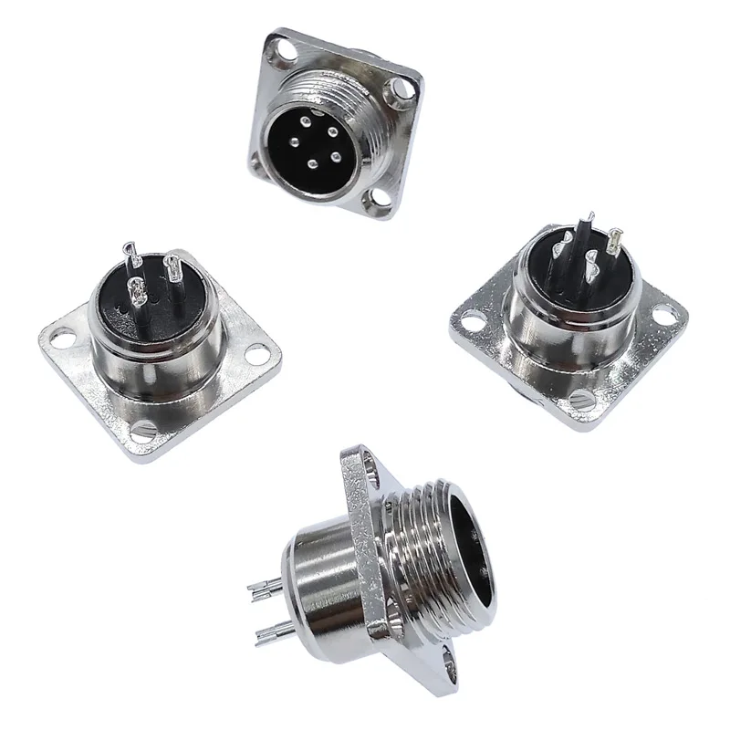 Meet this high-quality GX12 connector with a square flange socket, designed for durability and precision. Featuring a shiny, chrome-like finish, it combines a sleek, metallic look with robust construction. The connector's square base flange with smoothly rounded mounting holes allows easy, secure installation onto various panels or enclosures. Inside, a black insulator insert securely houses the metal pins, which are precisely arranged for optimal electrical performance. Available in configurations of 2, 3, 4, 5, 6, or 7 pins with a 12mm diameter, this connector is suitable for diverse industrial and electronic applications. Its 24V operation, CE certification, and chemical-free construction assure safety, quality, and long-lasting performance. Visualize these connectors seamlessly integrating into your device for a professional and durable connection solution.