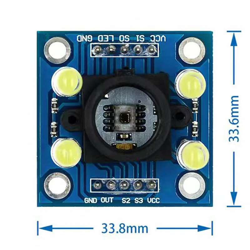 The GY-31/GY-33 TCS34725 TCS3200D/TCS230 Color Identification Sensor is designed for precision color detection, operating with a supply voltage of 3-5V. It features an 8-pin SOIC surface mount package containing 64 photodiodes: 16 with red filters, 16 with green filters, 16 with blue filters, and 16 for full light transmission. With a typical output frequency range of 2 Hz to 500 kHz, it offers programmable output scaling factors of 20% or 2%, along with a power shutdown mode. The sensor can detect colors of non-luminous objects and includes a white LED for light control. PCB dimensions are 33mm x 25mm.