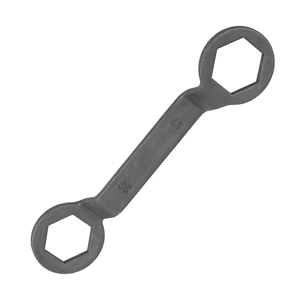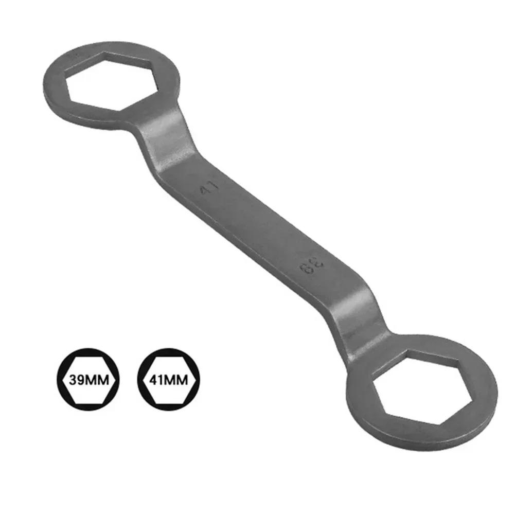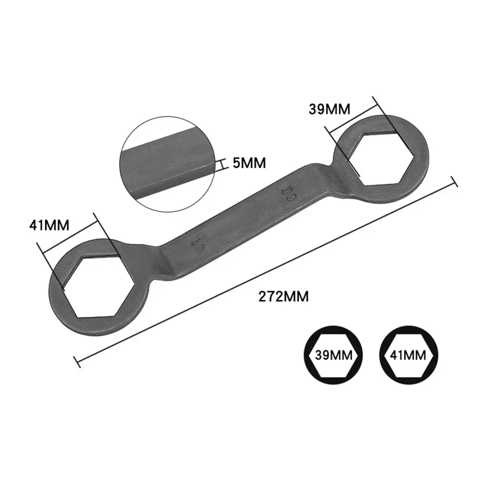 Experience reliable performance with this high-quality steel pulley hexagon nut removal wrench, specifically designed for GY6 125cc motorcycles and scooters. The tool's sleek, matte metallic finish ensures durability and resistance to wear. Measuring approximately 272 mm in length, it provides ample leverage for effortless pulley nut removal. The double-ended design features two precisely machined hexagon openings—39mm on one end and 41mm on the other—catering to different pulley nut sizes for versatile use. Its simple and functional design emphasizes strength and efficiency, making maintenance tasks easier and faster. With engraved size markings for quick identification, this wrench is an essential addition for motorcycle enthusiasts and professional mechanics alike, ensuring a secure grip and smooth operation every time.