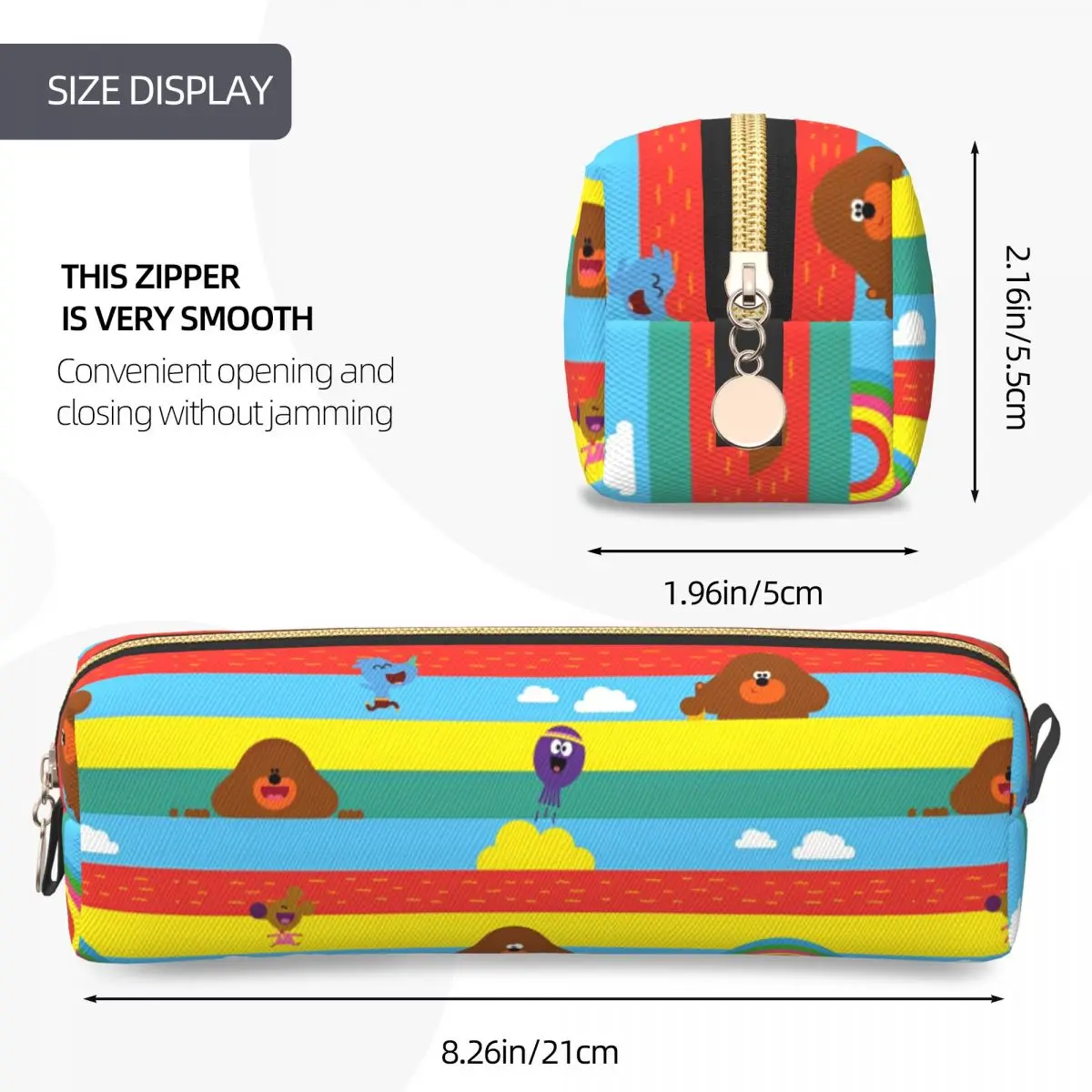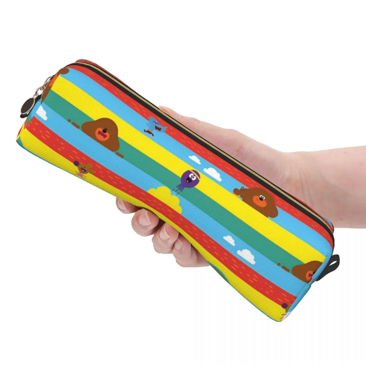 This vibrant pencil case features a playful design with a bright blue background complemented by wide horizontal stripes in yellow, red, and green. Adorned with whimsical cartoon animal characters, including a brown bear, a smiling yellow cloud, and a purple creature, it exudes a fun and cheerful aesthetic. Crafted from durable leather material, this big-capacity pencil case is perfect for school and office use. Its rectangular shape with rounded edges ensures both style and functionality, while a metallic gold zipper closure with a small pull tab adds a touch of elegance. Elevate your school supplies with this charming novelty pencil case.