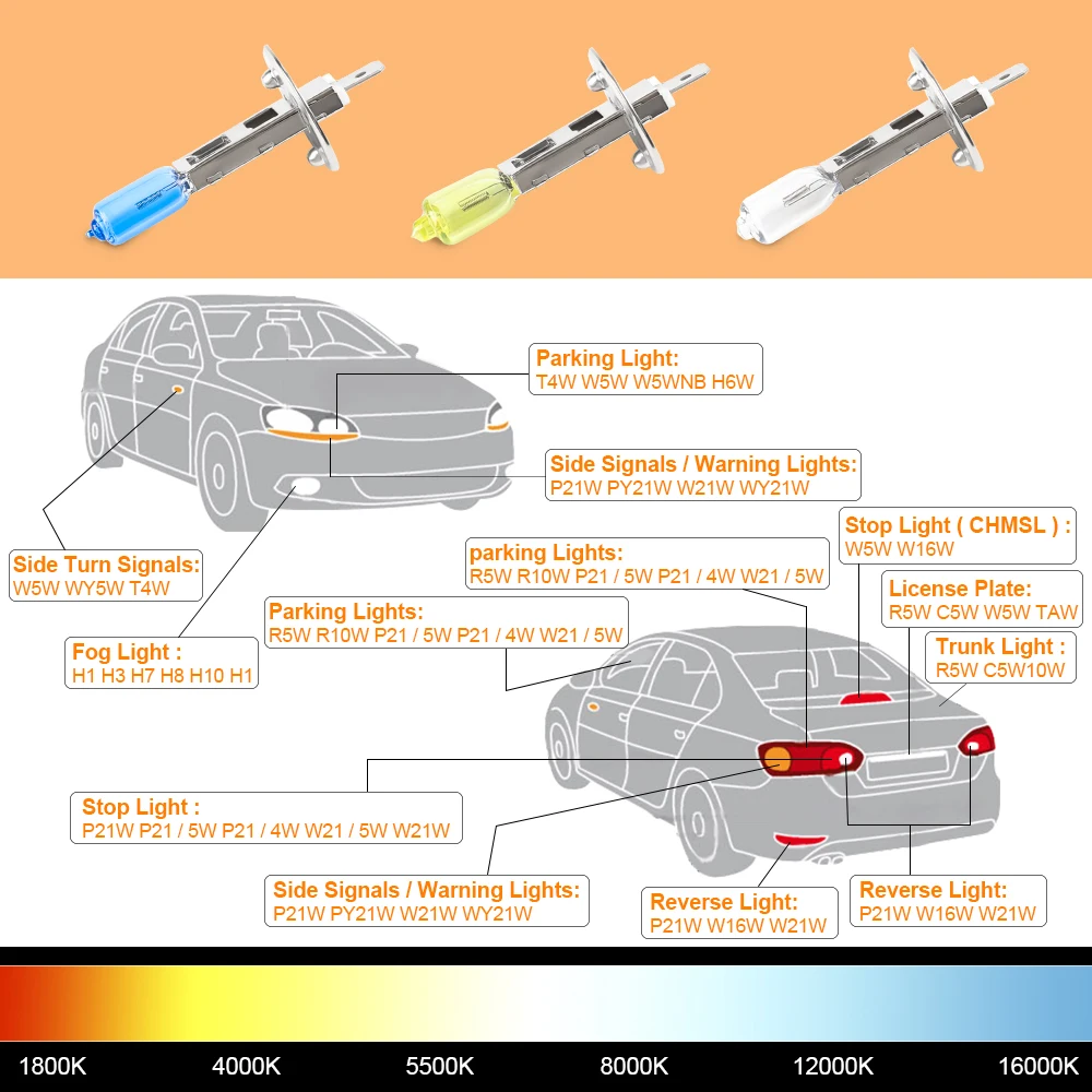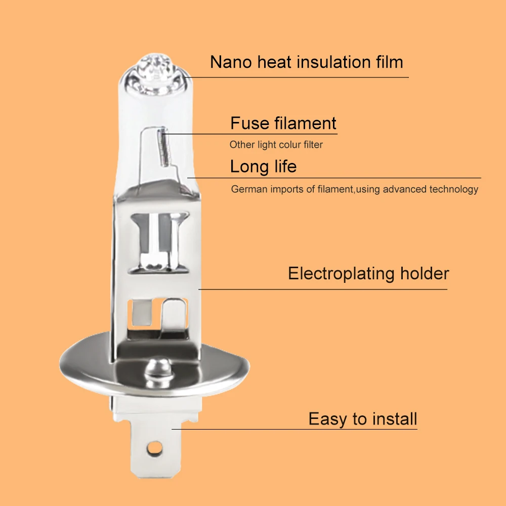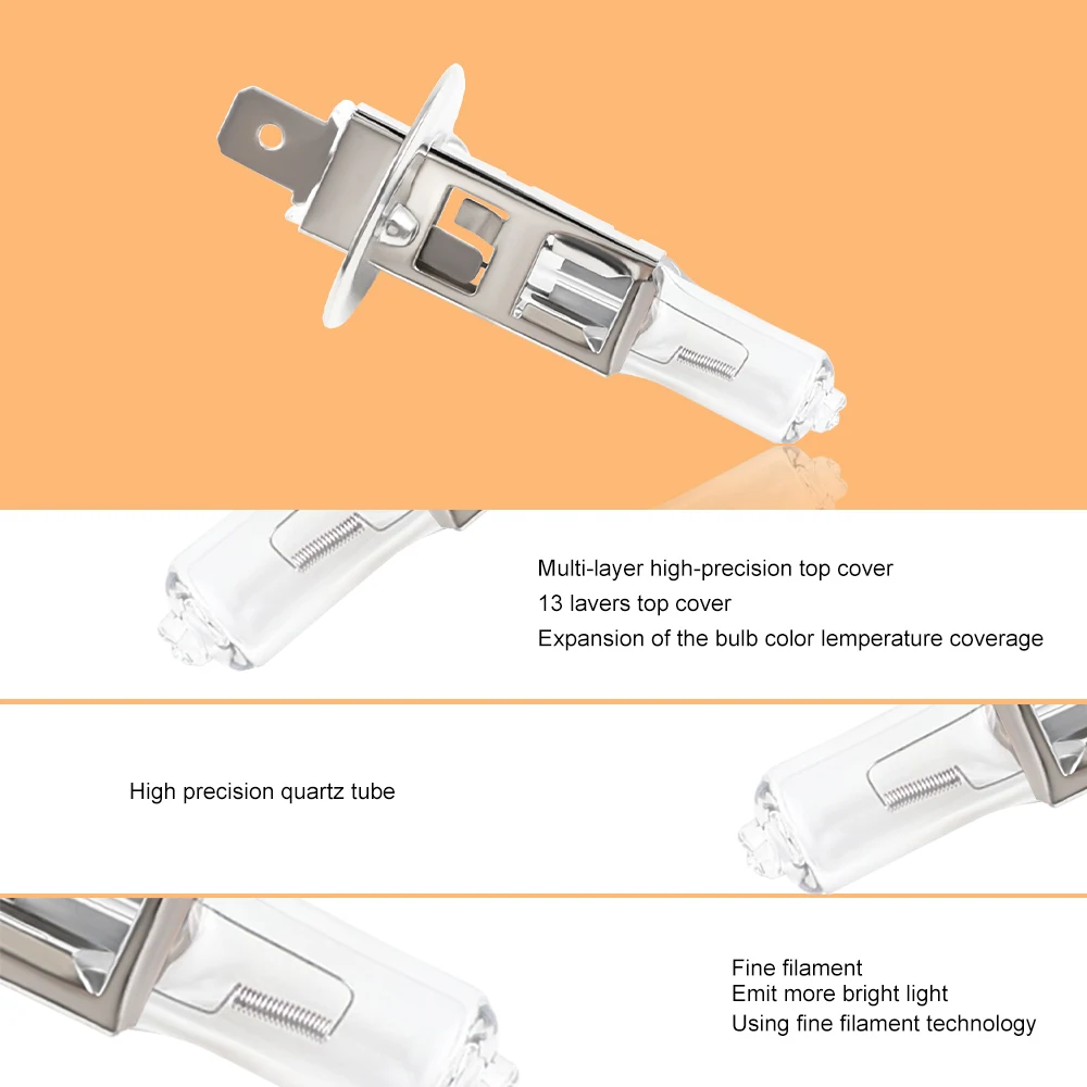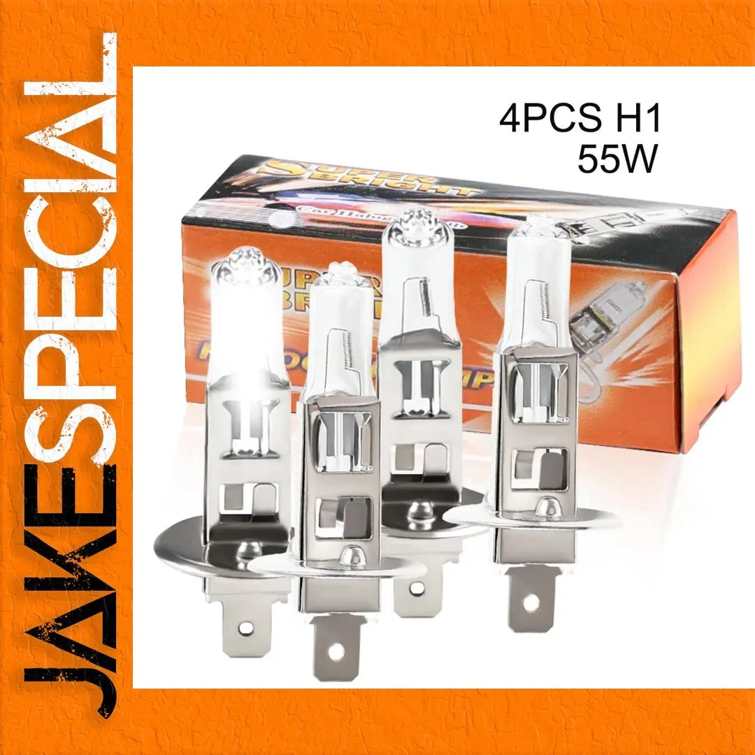 Experience enhanced visibility with this set of four H1 halogen bulbs, each rated at 55W and 12V, emitting a bright yellow light at 4500K. Featuring a sleek, clear glass envelope and a durable metallic base, these 55mm tall bulbs offer a high luminous efficacy for reliable performance in automotive headlight and fog lamp applications. Designed to operate at higher temperatures for increased brightness and efficiency, they are compatible with most vehicle types, providing a practical and stylish upgrade to external lighting systems. Perfect for drivers seeking clear, focused illumination with a modern, streamlined aesthetic.