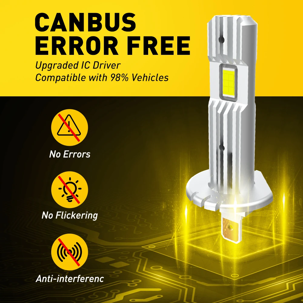 Upgrade your vehicle’s lighting with this set of two H1 LED headlight bulbs, delivering a powerful 12,000 lumens per pair and a crisp 6500K white light. Each 60W bulb features a compact, 1:1 size design with a sleek white finish, and utilizes high-efficiency CSP LED beads for superior brightness. Designed for easy plug-and-play installation, these fanless, IP67 waterproof bulbs are compatible with H1 sockets in cars and motorcycles, including VW Jetta, Beetle, Golf, Polo, and T5 models. With a lifespan of around 50,000 hours, non-polarity upgrade to prevent fuse burn-out, and a 1-year warranty, these bulbs combine modern style with reliable performance.