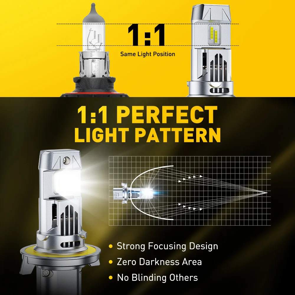 - Utilizes 16 CSP LED chips with a 360-degree beam angle, providing wide, even illumination without dark spots or glare, enhancing driving safety at night and in adverse weather conditions.
