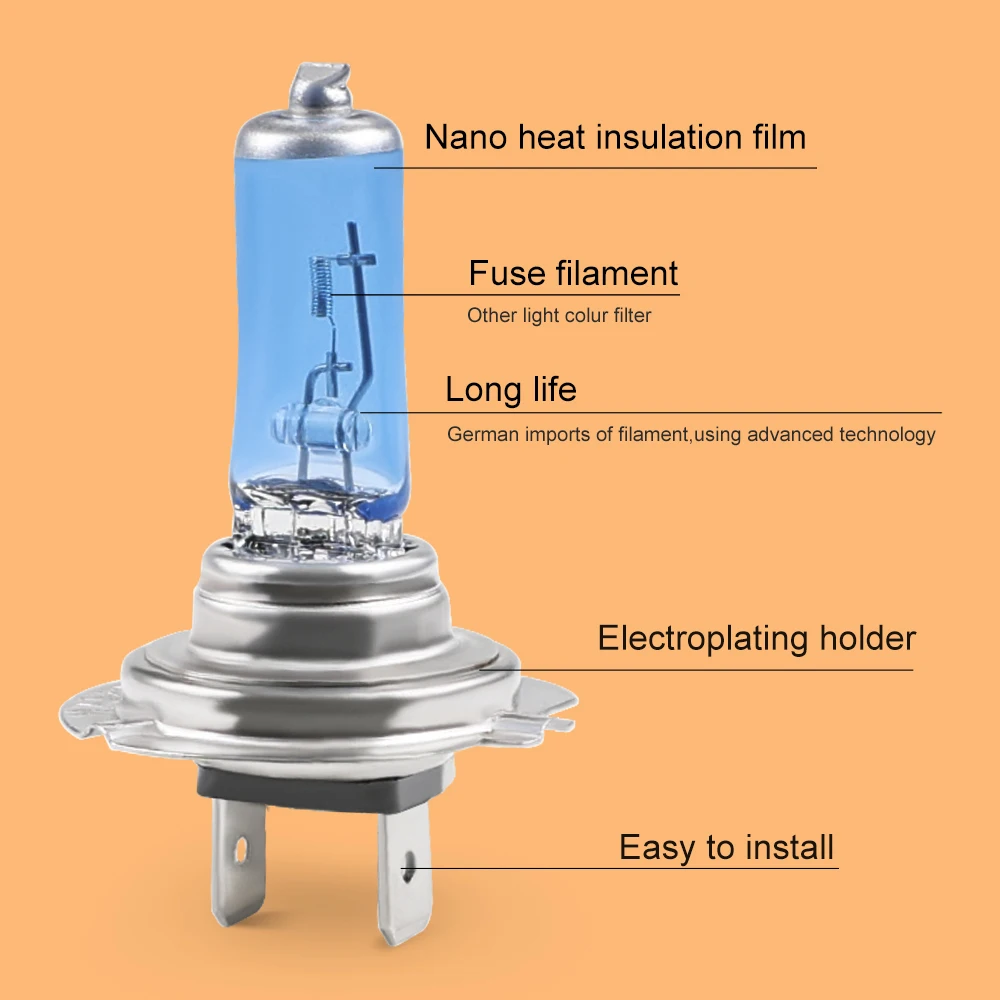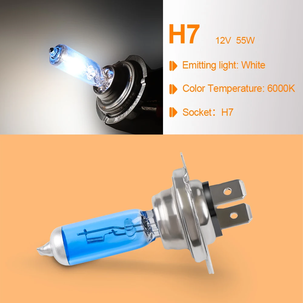 Imagine upgrading your vehicle’s lighting with these high-quality H7 halogen bulbs that deliver a stunning super white, 6000K xenon-style glow. Designed for effortless installation, simply plug and replace your existing low beam headlights for an instant upgrade. Their sleek, transparent glass capsule showcases a pristine, smooth, rounded top, emitting a bright, bluish-white light that enhances visibility and style on the road. The reflective metallic base adds a modern, industrial touch to the minimalist design, emphasizing precision and clarity. With a lightweight build and compact packaging, these bulbs are perfect for drivers seeking durability, style, and superior illumination without hassle, making your driving experience safer and more stylish.