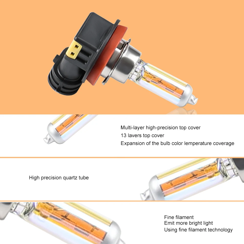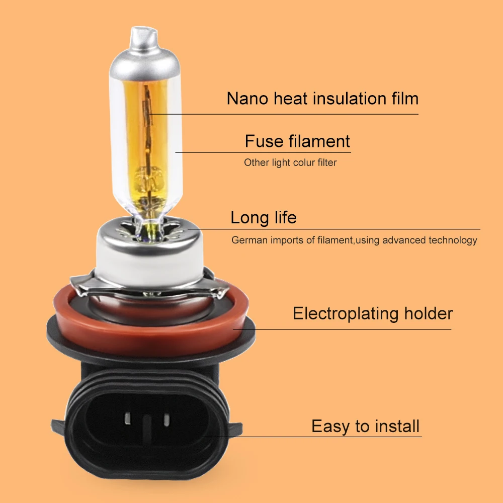 Experience enhanced driving safety with this pair of high-performance H8 halogen bulbs. Designed with a sleek, elongated quartz glass envelope, each bulb allows you to see precisely ahead, thanks to the internal tungsten filament supported by fine metal wires. The warm, golden yellow light at 2300K creates a distinctive, bright beam that improves visibility significantly. Perfect for upgrading your vehicle's headlights, these bulbs combine durability with impressive luminous output of about 900 lumens. Their high brightness, long lifespan, and seismic focus lighting make night driving safer and more comfortable. Easy to install, these bulbs are compatible with a wide range of car models, ensuring a seamless fit and consistent lighting performance over time, giving you peace of mind on every journey.