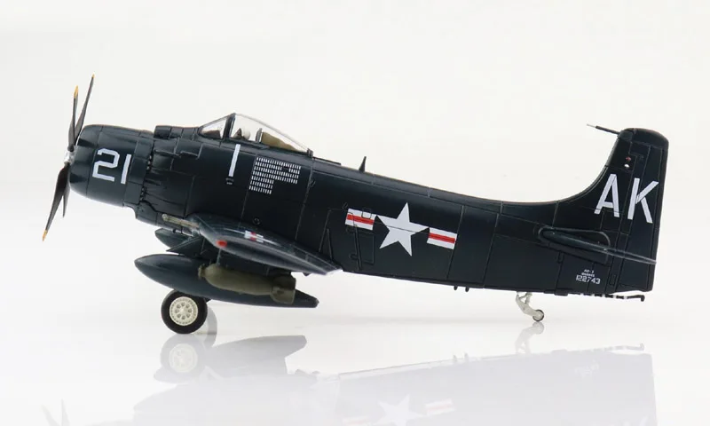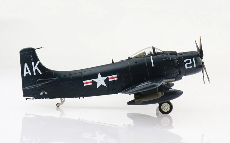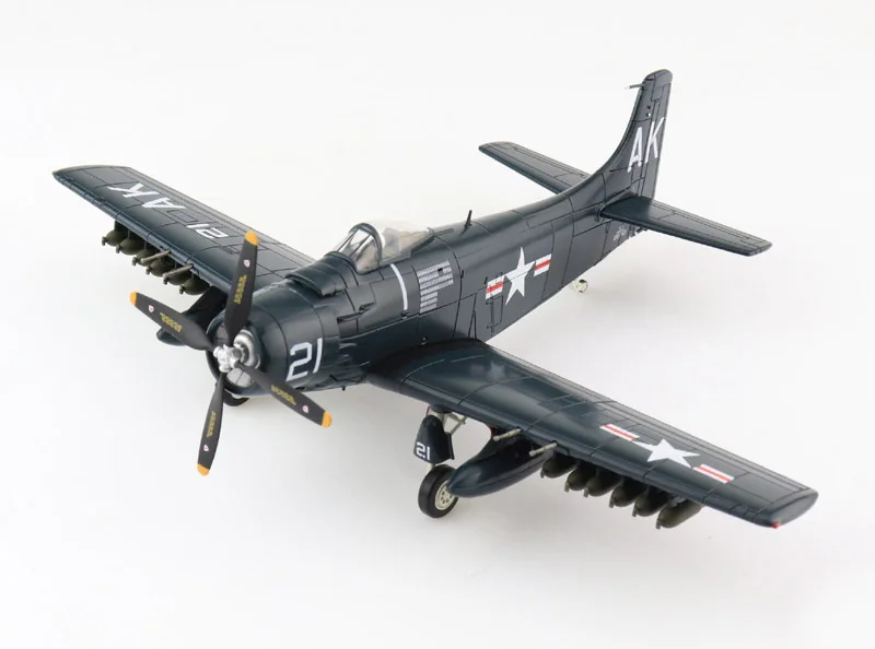 Indulge your passion for aviation with this stunning HA2918 1/72 scale model of the US AD-3 fighter aircraft. Crafted from high-quality diecast alloy, this beautifully detailed replica showcases a deep blue color with a glossy finish, along with striking white and red accent stripes that highlight its military heritage. Measuring approximately 16 cm in length and 21 cm in wingspan, this model captures the essence of the original aircraft with incredible precision. The detailed cockpit and accurately designed wings will transport you to the era of iconic fighter planes, making it a perfect display piece for collectors and aviation enthusiasts alike.