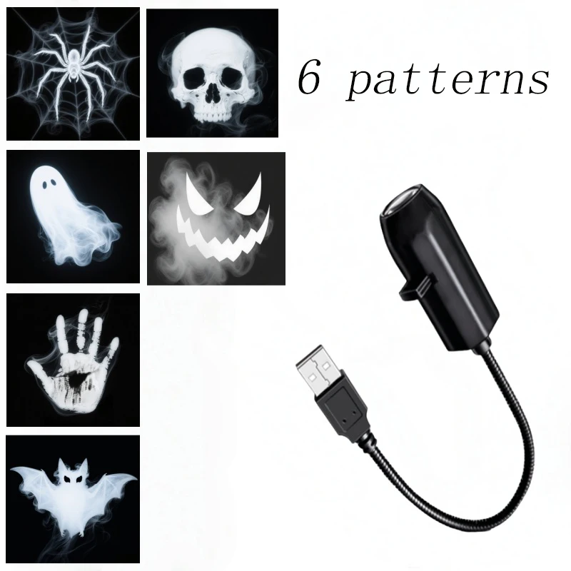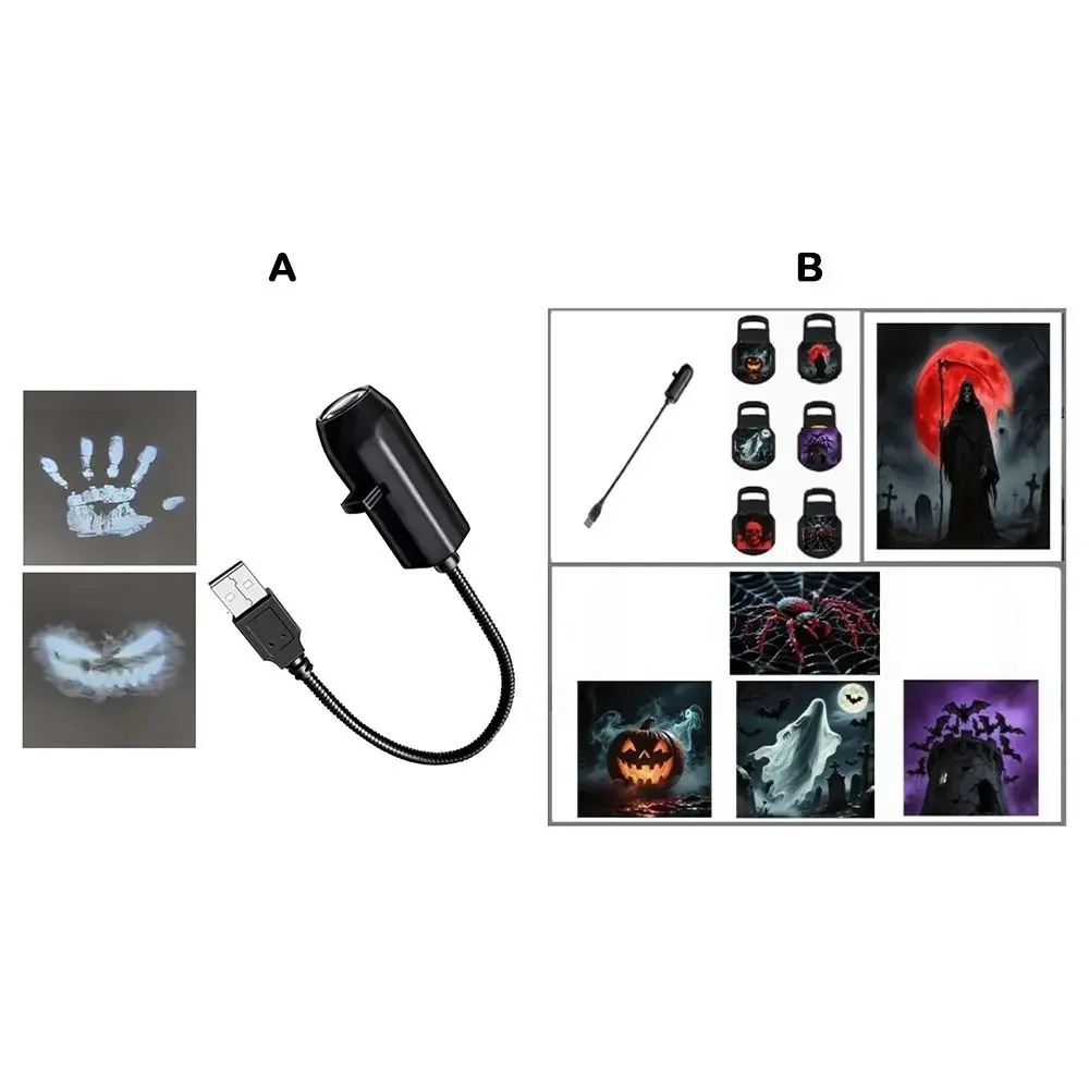 Transform your space into a spooky Halloween scene with this sleek, compact Halloween USB projection night light. Designed with a modern matte black finish, it features a rectangular, handheld shape that is both stylish and highly functional. The device boasts a flexible gooseneck arm, allowing you to easily adjust the direction of the eerie projections. Interchangeable faceplates showcase six haunting skull motifs, from realistic skull faces to sinister grinning skeletal visages and skeletal hand imprints, perfect for creating diverse spooky atmospheres. When turned on, it projects vivid, ghostly images of skulls and skeletal patterns onto walls and ceilings, emitting bright, contrasting tones that enhance any dark room. Ideal for holiday displays, themed parties, or creating a chilling ambiance, this night light offers a perfect touch of supernatural mystery to your environment.