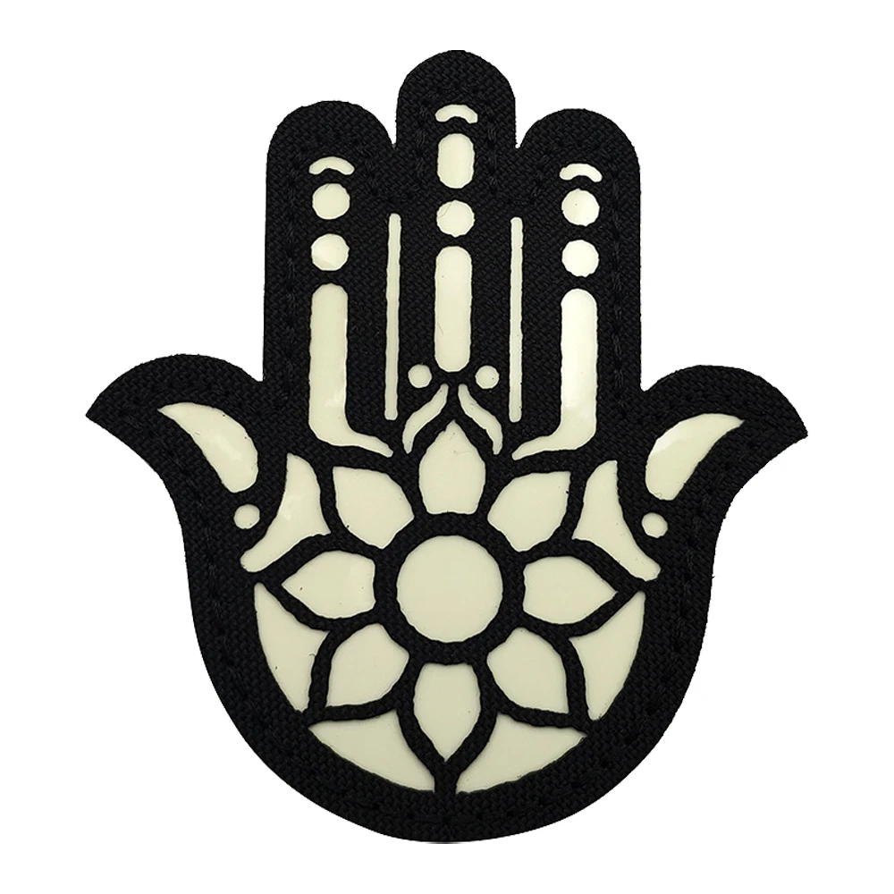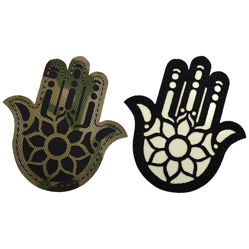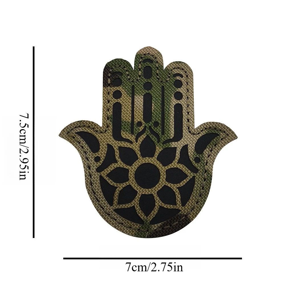 This tactical badge patch, designed in the iconic Hand of Fatima silhouette, will not only beautify your gear but also symbolize protection and strength. Crafted from a durable blend of Nylon, Polyester, and PVC, this patch features a striking camouflage color scheme in shades of green and intricate black detailing. With a textured surface that creates a dimensional look, it boasts a floral pattern at the base and adorned stylized fingers. The patch attaches easily with a hook and loop backing, making it adaptable for jackets, backpacks, hats, and more. Visualize this patch elevating your tactical collection!
