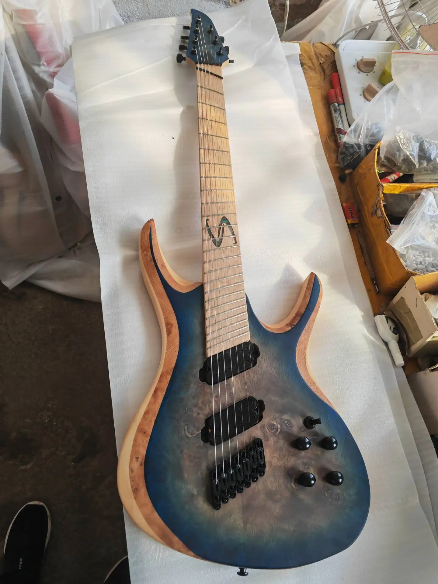 Experience the perfect blend of bold design and rich sound with this handcrafted 7-string electric guitar. Its striking body features a vibrant blue burst finish smoothly transitioning from deep blue to natural wood tones, accentuated by a glossy surface that highlights the flame or quilted maple figure. The arched top and unique angular cutaways contribute to its contemporary, edgy appeal. Rounded edges with light-colored natural wood binding create a striking contrast against the colorful body. Equipped with a maple neck and fingerboard with 24 frets and abalone inlays, this guitar offers comfortable playability. Ideal for professionals or enthusiasts, it combines eye-catching aesthetics with outstanding tonal versatility, making it an exceptional addition to any collection or stage setup.